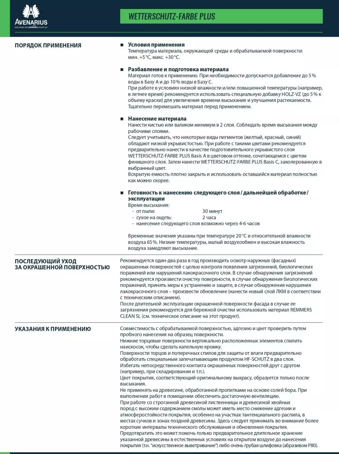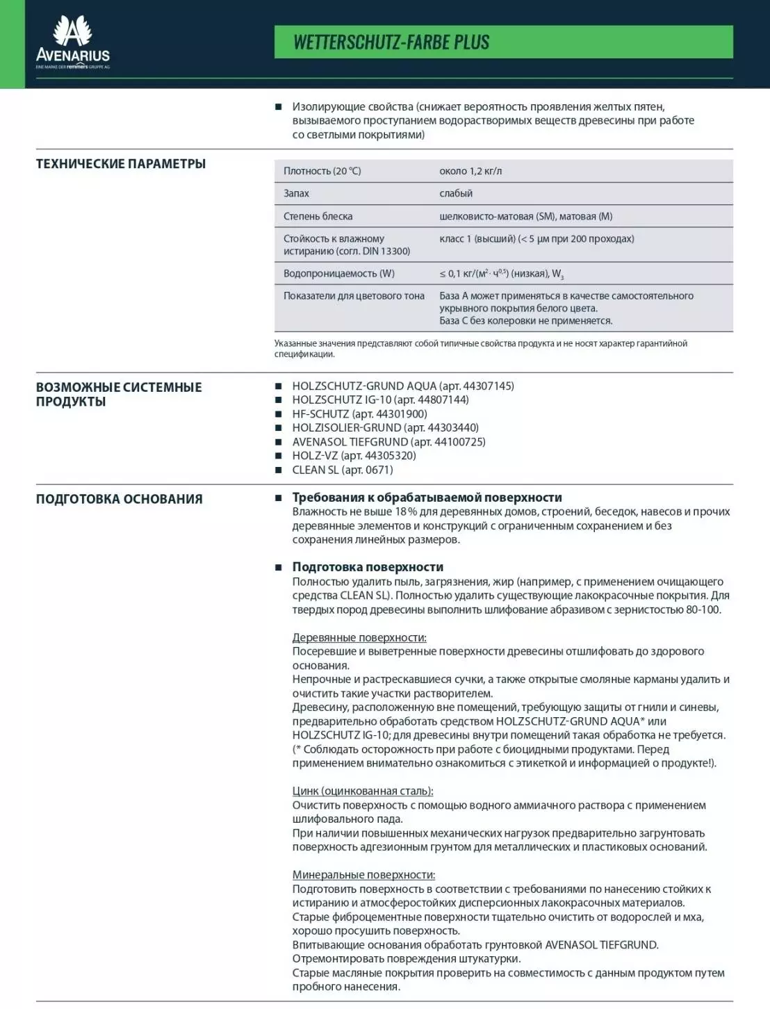Минеральные поверхности: Подготовить поверхность в соответствии с требованиями по нанесению стойких к истиранию и атмосферостойких дисперсионных лакокрасочных материалов. Старые фиброцементные поверхности тщательно очистить от водорослей и мха, хорошо просушить поверхность. Впитывающие основания обработать грунтовкой AVENASOL TIEFGRUND. Отремонтировать повреждения штукатурки. Старые масляные покрытия проверить на совместимость с данным продуктом путем пробного нанесения.