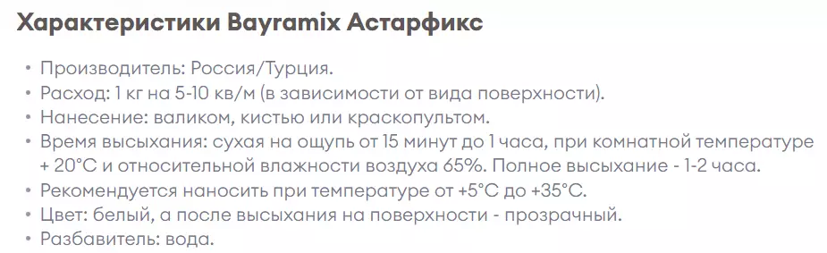 Грунтовка поверхностей - является необходимым этапом для их подготовки к нанесению различных отделочных и декоративных материалов - штукатурок, шпатлевок, плиточных клеев и других. Грунт глубокого проникновения Байрамикс Астар Фикс укрепляет старые, непрочные поверхности, а также уменьшает расход последующих материалов - красок, штукатурок и других декоративных покрытий. Он значительно улучшает сцепление последующего покрытия с поверхностью, а также позволяет ощутимо укрепить её, благодаря наличию ультра мелких частиц в составе грунтовки, способных проникать в самые узкие поры, на глубину до 10 миллиметров! Кроме того, благодаря присутствию антисептических добавок, грунт Астар ФИКС предотвращает рост бактерий и препятствует образованию плесени. Не содержит органических растворителей и экологически чистый.