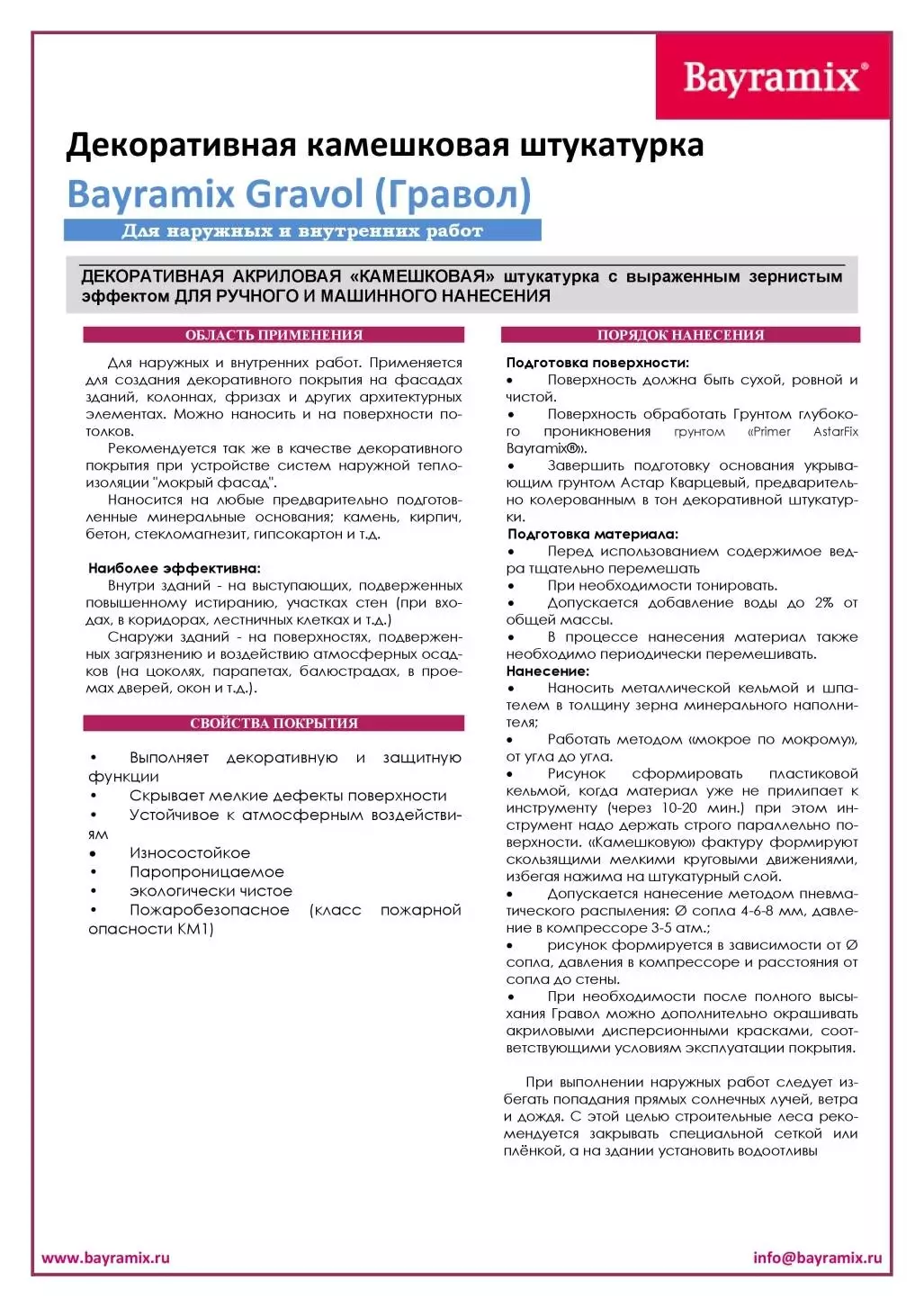 Для наружных и внутренних работ. Применяется для декоративного покрытия на фасадах зданий, колоннах, фризах, потолках и других архитектурных элементах. Рекомендуется для систем наружной теплоизоляции "мокрый фасад".