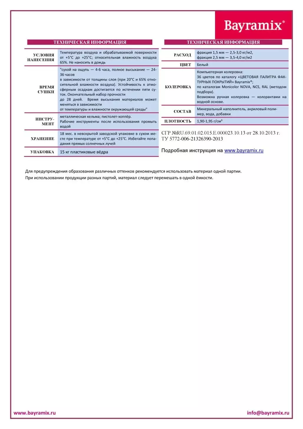 Производится в белом цвете, но может колероваться по каталогу "ЦВЕТОВАЯ ПАЛИТРА ФАКТУРНЫХ ПОКРЫТИЙ Bayramix®" и другим каталогам (Monicolor NOVA, NCS, RAL) методом подбора. Возможна ручная колеровка колорантами на водной основе.