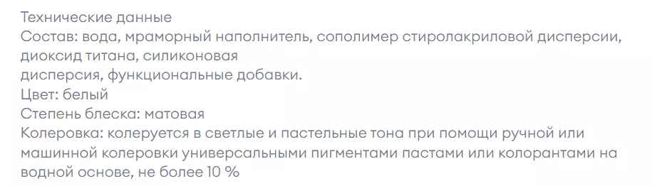 Состав: вода, мраморный наполнитель, сополимер стиролакриловой дисперсии, диоксид титана, силиконовая