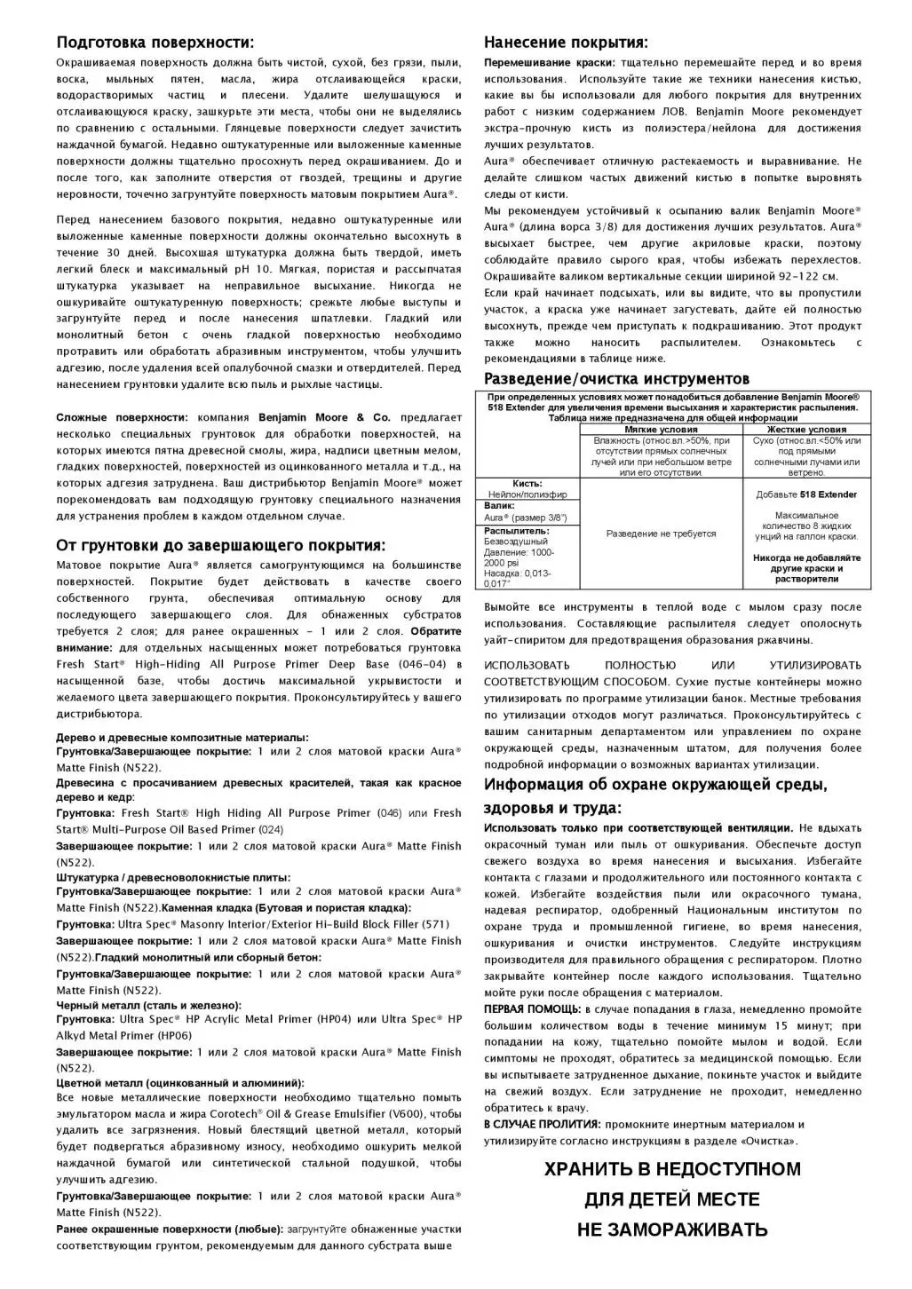 Перед нанесением краски поверхность необходимо очистить от загрязнений, жира, масел, шелушащейся краски, водорастворимых материалов и плесени и старых покрытий. Шелушащуюся краску нужно удалить и отшлифовать до тонкого, гладкого состояния. Гипсокартон не должен содержать шлифовальной пыли. На голый бетон или штукатурку, а так же обои под покраску необходимо наносить два слоя, на уже окрашенную поверхность и гипсокартон достаточно одного. Тщательно перемешайте краску перед началом работ. Для достижения лучшего результата используйте профессиональную нейлоновую кисть или ворсовый валик Benjamin Moore. Периодически перемешивая краску, нанесете первый слой, равномерно распределяя материал по поверхности. Не проводите кистью слишком часто, так как краска Aura 522 сохнет быстрее, чем другие акриловые краски, поэтому, чтобы избежать нахлестки, оставляйте влажный край. Если край начинает сохнуть или какая-то часть поверхности осталась неокрашенной, сначала дайте всей поверхности полностью высохнуть, а потом подкрасьте неокрашенный участок. Для нанесения также можно использовать метод распыления.