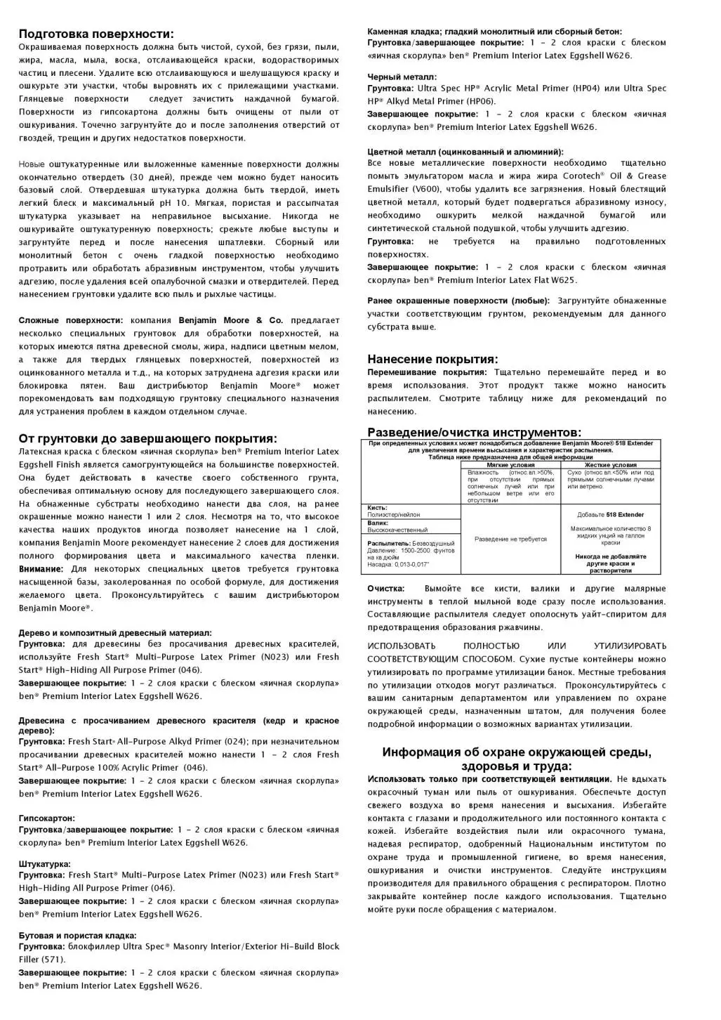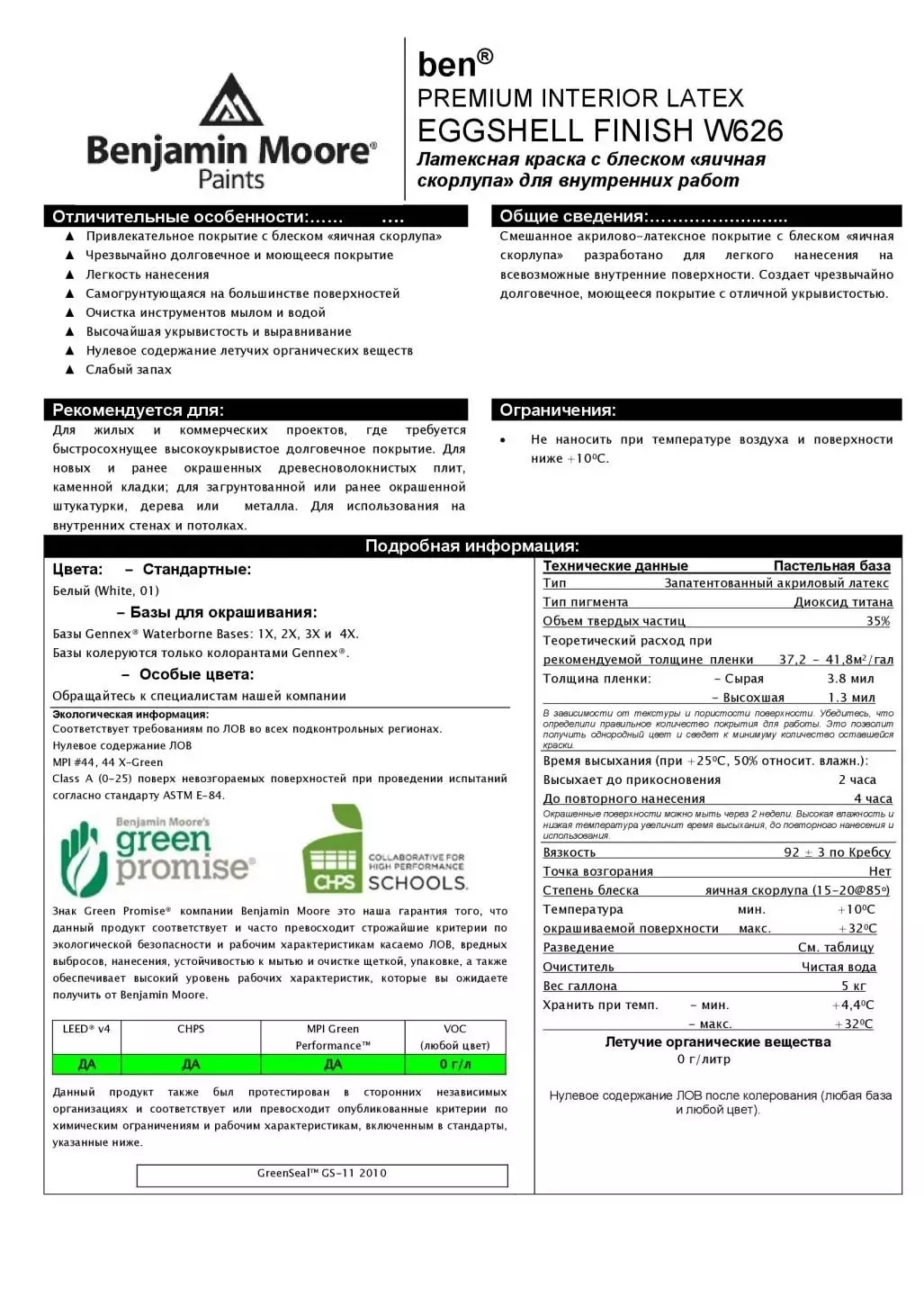 Краска Ben W626 Waterborne Interior Paint Eggshell разработана компанией Benjamin Moore специально для внутренних работ. Рекомендуется для создания долговечного покрытия в помещениях, где часто проводятся влажные уборки, например спальнях или гостиных. Также может применяться для новых или ранее окрашенных древесноволкнистых плит, кирпичной кладки или поверхностей покрытых обоями, загрунтованной или раннее окрашенной штукатурки, древесины или металла, новых или окрашенных акустических потолков. Идеально подходит для нанесения в жилых помещениях для потолков и стен.