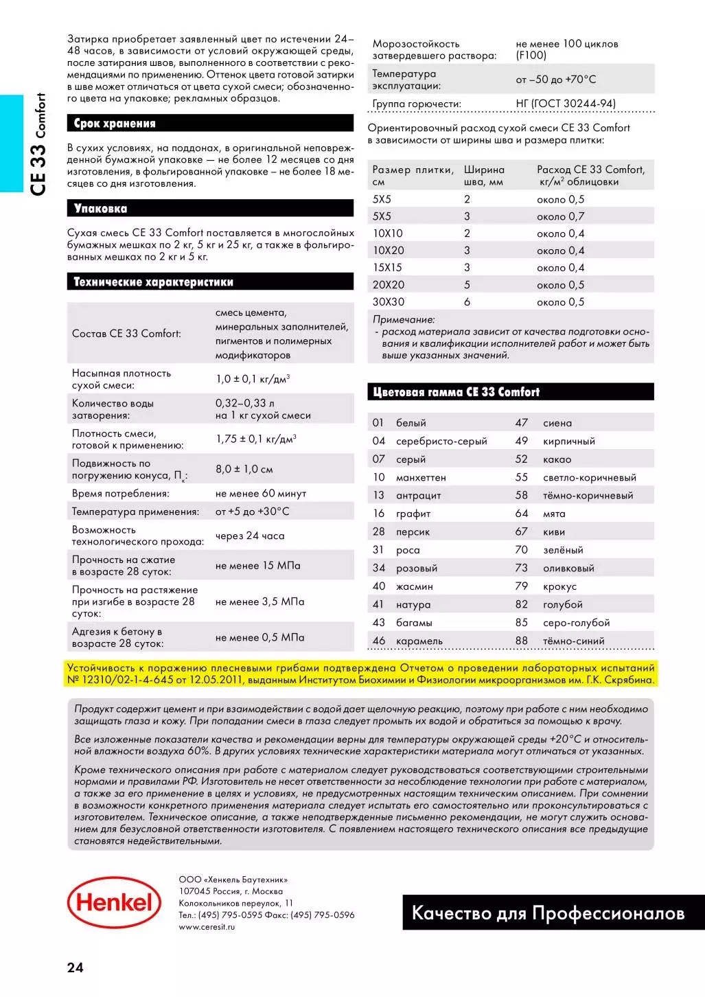 Затирка приобретает заявленный цвет по истечении 24–48 часов, в зависимости от условий окружающей среды, после затирания швов, выполненного в соответствии с рекомендациями по применению. Оттенок цвета готовой затирки в шве может отличаться от цвета сухой смеси; обозначенного цвета на упаковке; рекламных образцов.