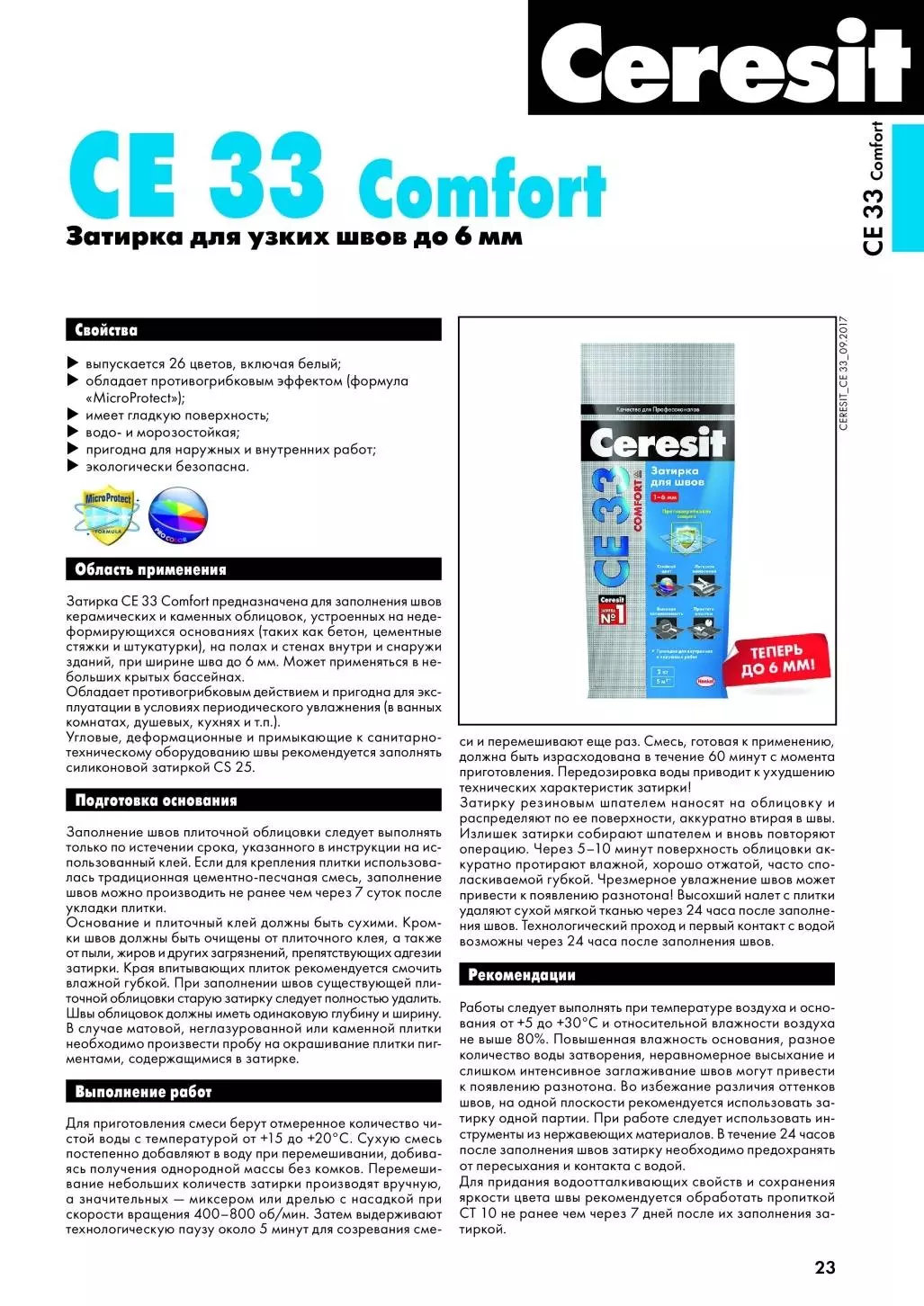 Затирка CE 33 Comfort предназначена для заполнения швов керамических и каменных облицовок, устроенных на недеформирующихся основаниях (таких как бетон, цементные стяжки и штукатурки), на полах и стенах внутри и снаружи зданий, при ширине шва до 6 мм. Может применяться в небольших крытых бассейнах.
