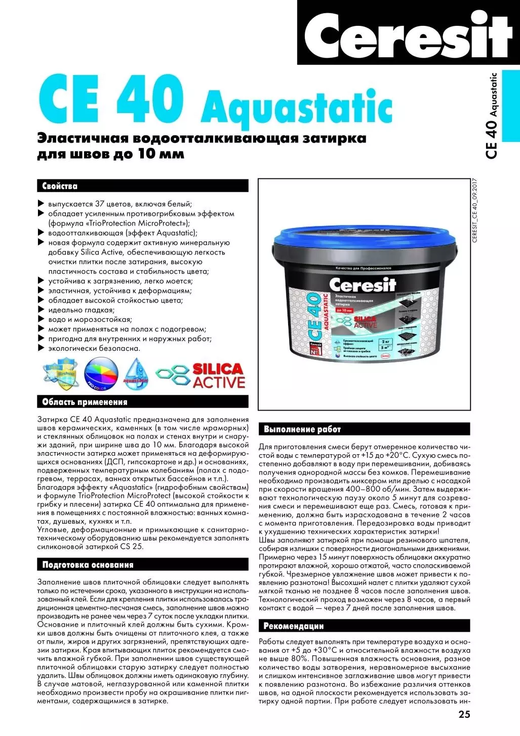 Затирка CE 40 предназначена для заполнения швов облицовок из керамических, каменных (в том числе мраморных) и стеклянных (кроме зеркальных) плиток на полах и стенах внутри и снаружи зданий, при ширине шва до 10 мм. Рекомендована для жилых помещений с повышенной влажностью (ванные комнаты, душевые, кухни и тд) и нормальной влажностью (гостиные, коридоры и тд), а также общественных и промышленных помещений. Сертифицирована для применения в детских и медицинских учреждениях.