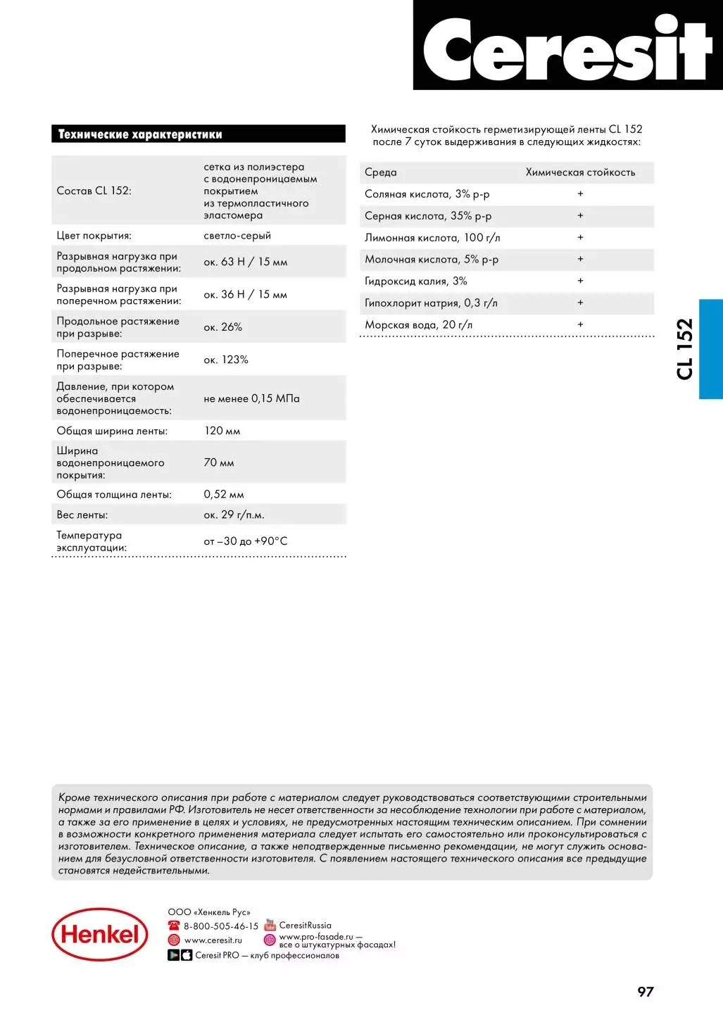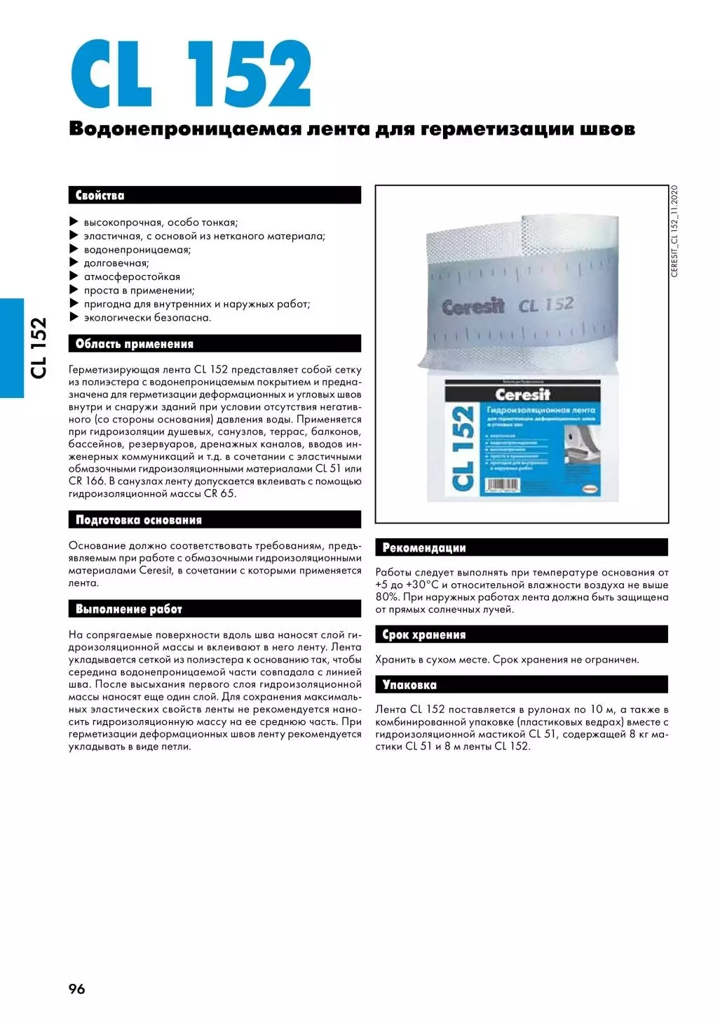 Ceresit CL 152 - это специальная высокопрочная водонепроницаемая лента для герметизации различных швов. Имеет хорошую атмосферостойкость и устойчива к УФ излучениям. Может использоваться для наружных и внутренних работ. Подходит для герметизации швов в ваннах, кухнях, террасах и балконах или в других инженерных сооружениях. Лента проста в применении и полностью экологически безопасна.