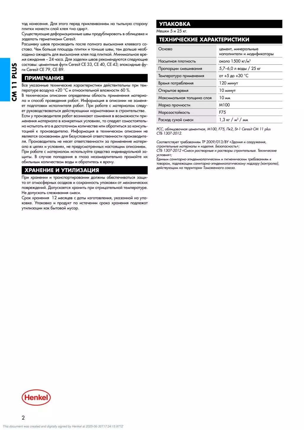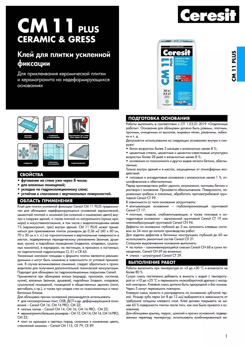 CERESIT® СМ 11 Plus предназначен для облицовки недеформирующихся оснований (цементная стяжка, штукатурка, плиты перекрытия, кирпичная кладка) плитками с площадью поверхности до 0,25 м2 (50 х 50 см, 60 x 40 см и т. п.):