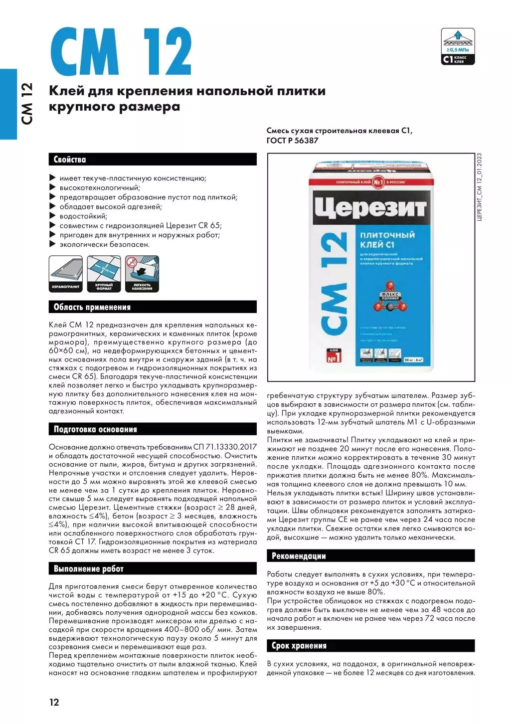Клей СМ 12 предназначен для крепления напольных керамогранитных, керамических и каменных плиток (кроме мрамора), преимущественно крупного размера (до 60х60 см), на недеформирующихся бетонных и цементных основаниях пола внутри и снаружи зданий (в т. ч. на стяжках с подогревом и гидроизоляционных покрытиях из смеси CR 65). Благодаря текуче-пластичной консистенции клей позволяет легко и быстро укладывать крупноразмерную плитку без дополнительного нанесения клея на монтажную поверхность плиток, обеспечивая максимальный адгезионный контакт.
