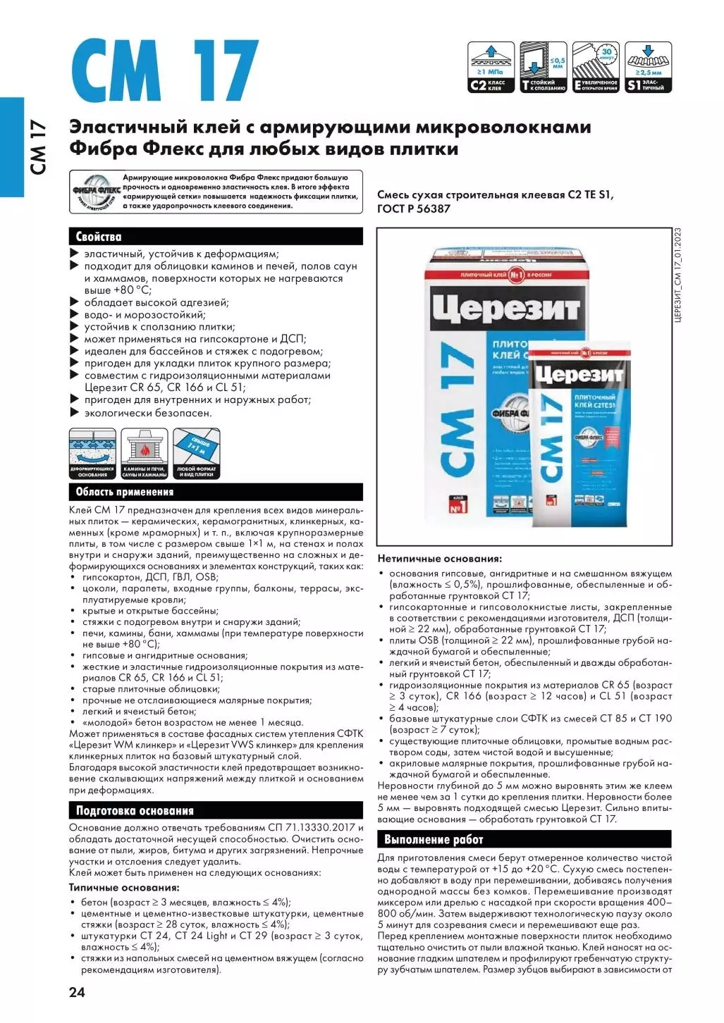 Основание должно отвечать требованиям СП 71.13330.2017 и обладать достаточной несущей способностью. Очистить основание от пыли, жиров, битума и других веществ, снижающих адгезию клея. Непрочные участки и отслоения следует удалить. Неровности глубиной до 5 мм можно выровнять клеем СМ 17 не менее чем за 1 сутки до крепления плитки. Неровности более 5 мм – выровнять подходящей смесью. Сильно впитывающие основания - обработать грунтовкой СТ 17. Гладкие основания из монолитного бетона на стенах рекомендуется обработать грунтовкой CT 19 Бетонконтакт.