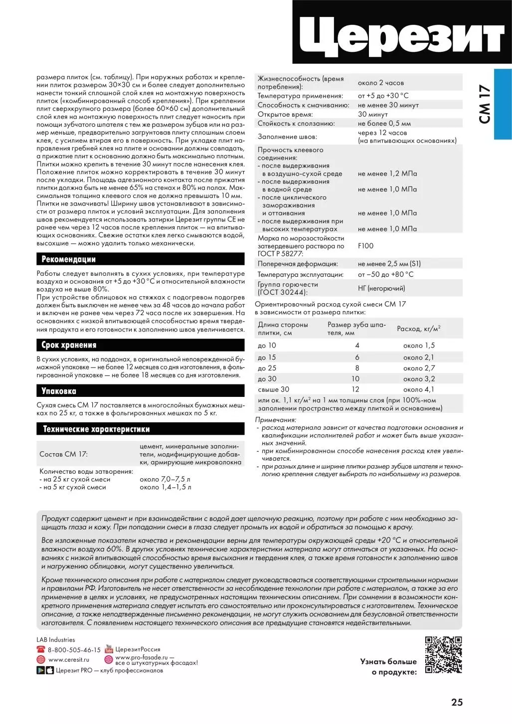 Плитки можно крепить в течение 30 минут после нанесения клея. Положение плиток можно корректировать в течение 30 минут после укладки. Площадь адгезионного контакта после прижатия плитки должна быть не менее 65% на стенах и 80% на полах. Плитки предварительно не замачивать! Ширину швов устанавливают в зависимости от размера плиток и условий эксплуатации. Для заполнения швов рекомендуется использовать затирки Церезит группы СЕ не ранее чем через 12 часов после крепления плиток - на впитывающих основаниях.