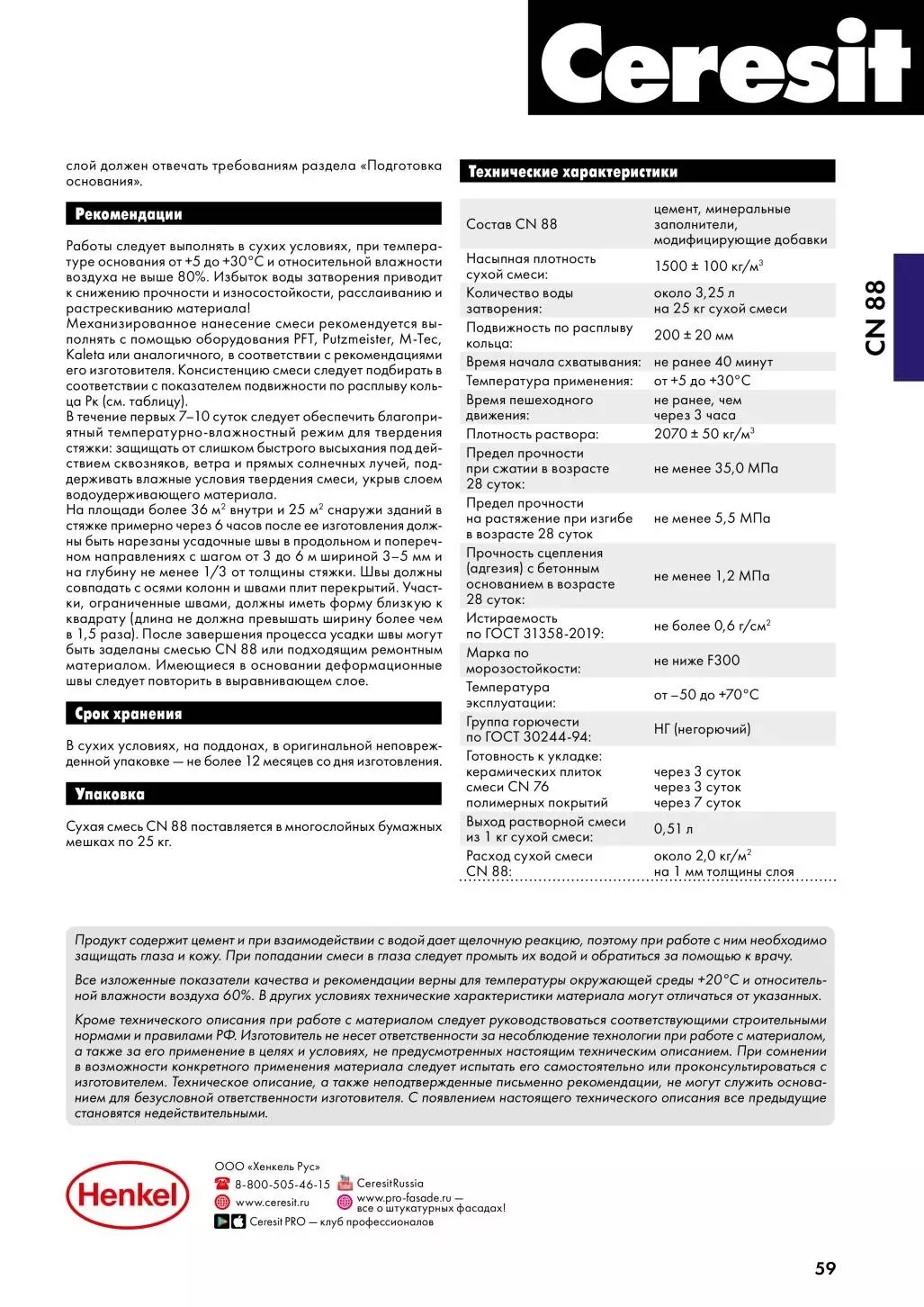 Ceresit CN 88 - это высокопрочная смесь для создания и выравнивания стяжек пола. Увеличенная прочность поможет справляться даже с большими нагрузками, может применяться без основного покрытия в качестве основания под укладку. Смесь легко наносится, просто выравнивается и поможет организовать технологический проход уже через 6 часов. Может применяться для механического нанесения. Подходит для наружных и внутренних работ.