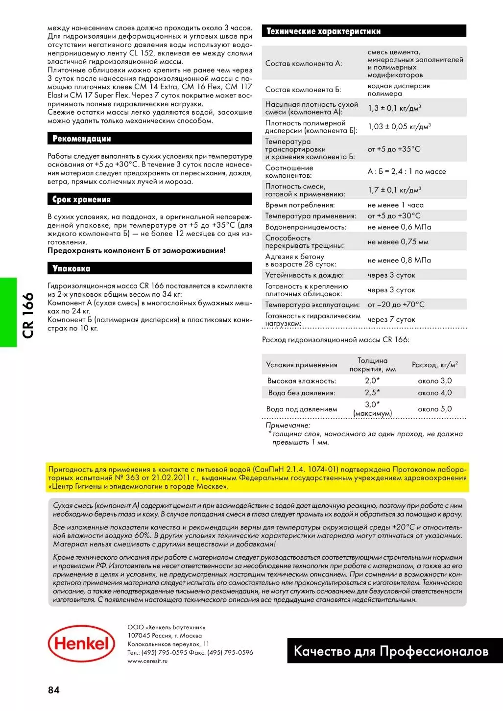Гидроизоляционная масса CR 166 предназначена для устройства эластичных гидроизоляционных покрытий на незасоленных минеральных не содержащих гипс основаниях, в т.ч. подверженных деформациям, внутри и снаружи зданий. Замедляет процесс карбонизации, обеспечивает эффективную защиту бетона и железобетона от атмосферной влаги, брызг и тумана, повышает долговечность бетонных и железобетонных конструкций.