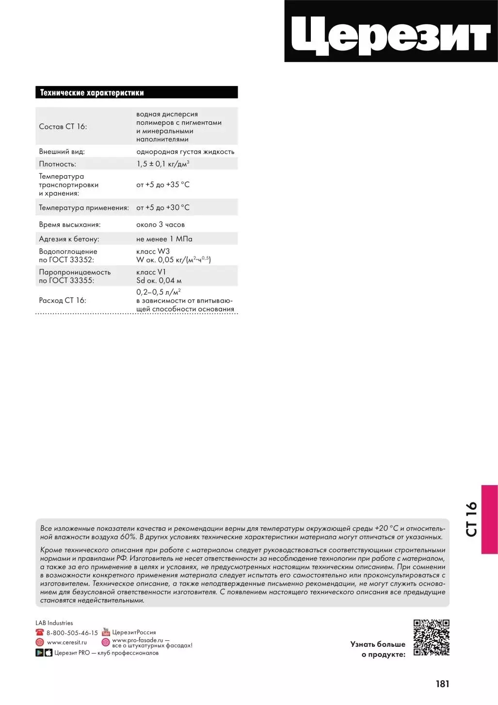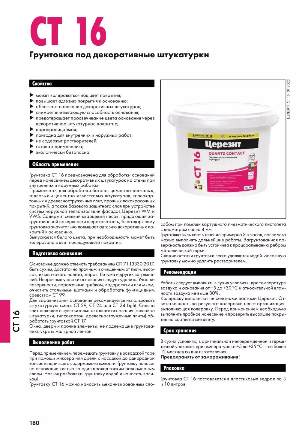 Грунтовка CT 16 предназначена для обработки оснований перед нанесением декоративных штукатурок на стены при внутренних и наружных работах.