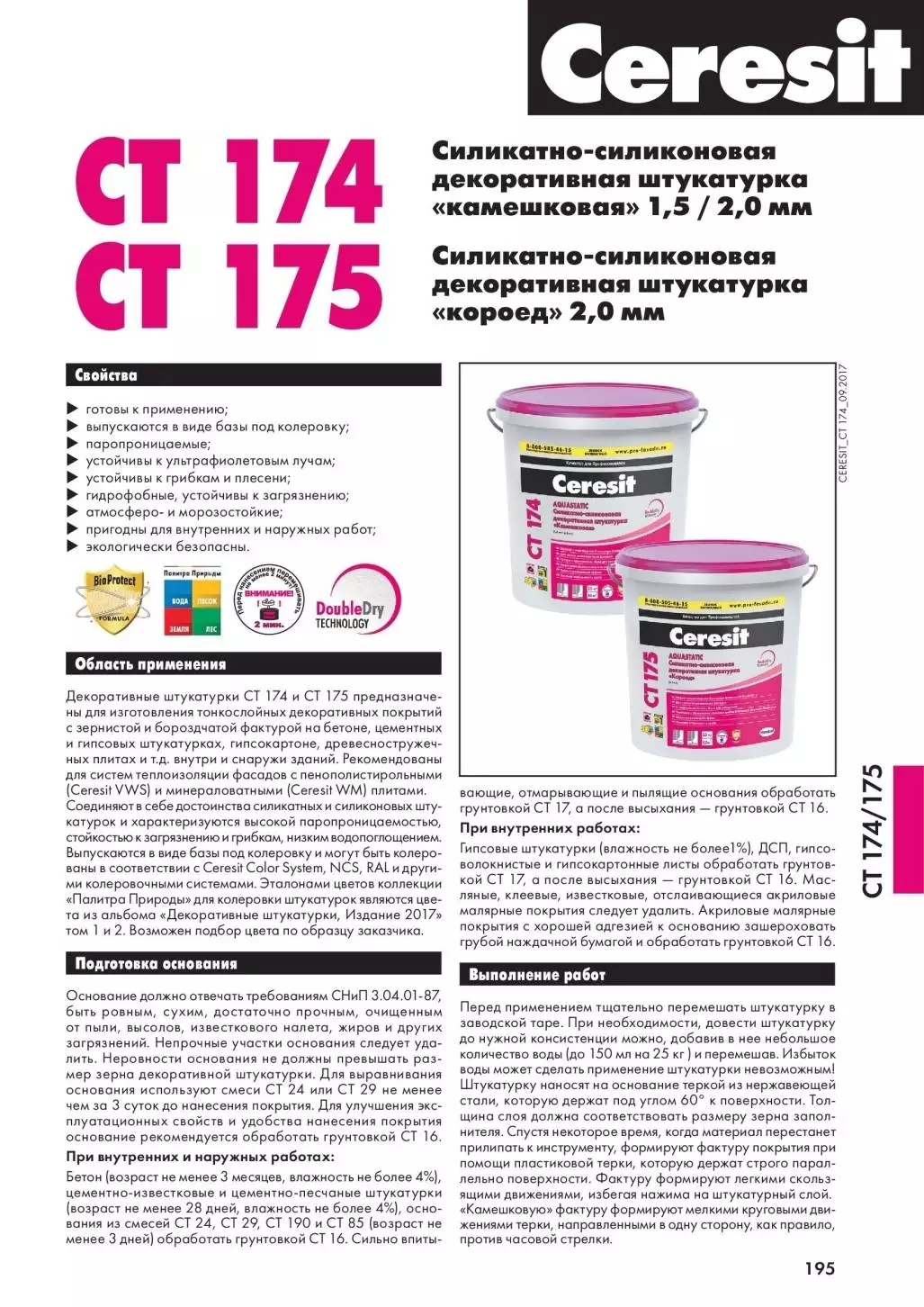 Ceresit CT 175 - это специальная декоративная штукатурка с силикатно-силиконовым основанием для создания эффекта “Короед”. Штукатурка устойчива к различным негативным факторам, а так же не дает образоваться плесени и грибку. Отличная атмосферостойкость, позволяет использовать ее в регионах со сложным климатом. Могут применяться как для наружных так для внутренних работ. Легко колеруются и вы сможете создать уникальный, подходящий именно вам цвет. Ceresit - это высокий стандарт качества и экологической безопасности.