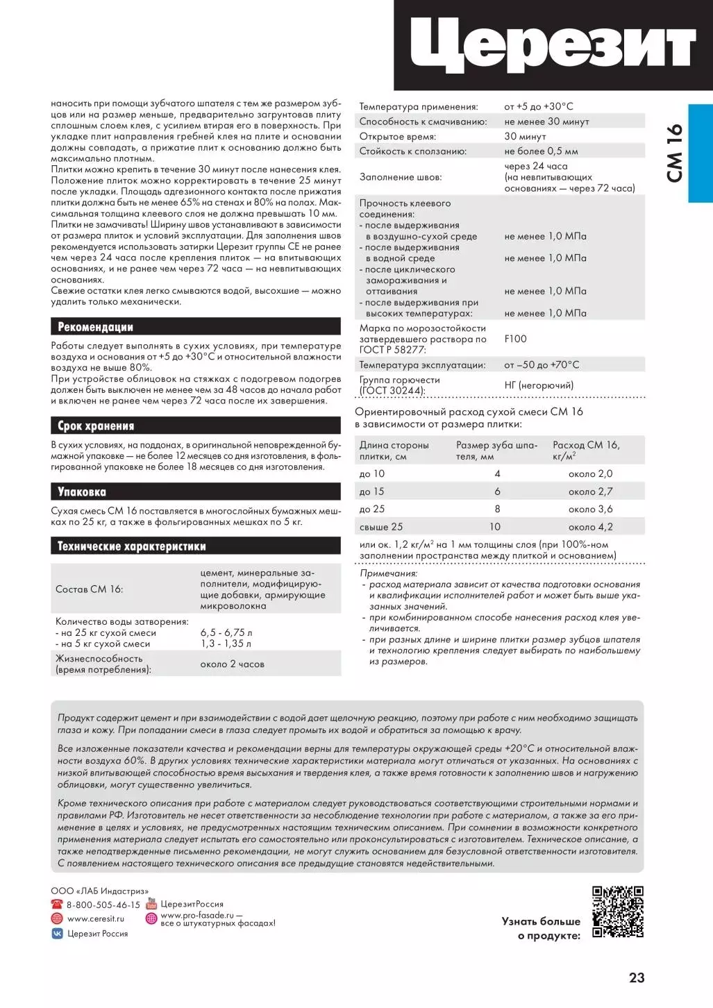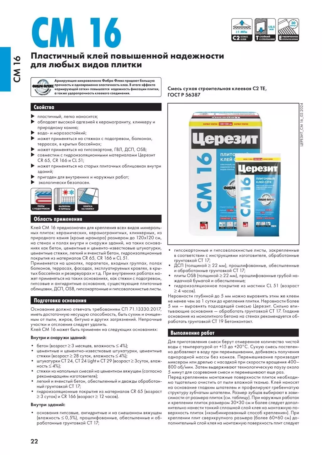 Клей CM 16 предназначен для крепления всех видов минеральных плиток: керамических, керамогранитных, клинкерных, из природного камня (кроме мрамора) размером до 1,2×1,2 м, на стенах и полах внутри и снаружи зданий, на таких основаниях как бетон, цементные и цементо-известковые штукатурки, цементные стяжки, легкий и ячеистый бетон, гидроизоляционные покрытия из материалов CR 65, CR 166 и CL 51. Применяется на цоколях, парапетах, входных группах, полах балконов и террас, эксплуатируемых кровлях, в крытых бассейнах и резервуарах и т.д. При внутренних работах может применяться на таких основаниях, как стяжки с подогревом, гипсовые и ангидритные основания, существующие плиточные облицовки, ДСП, OSB, гипсокартонные и гипсоволокнистые листы.