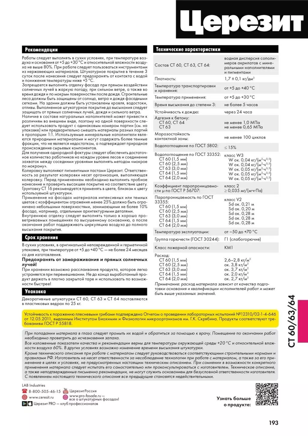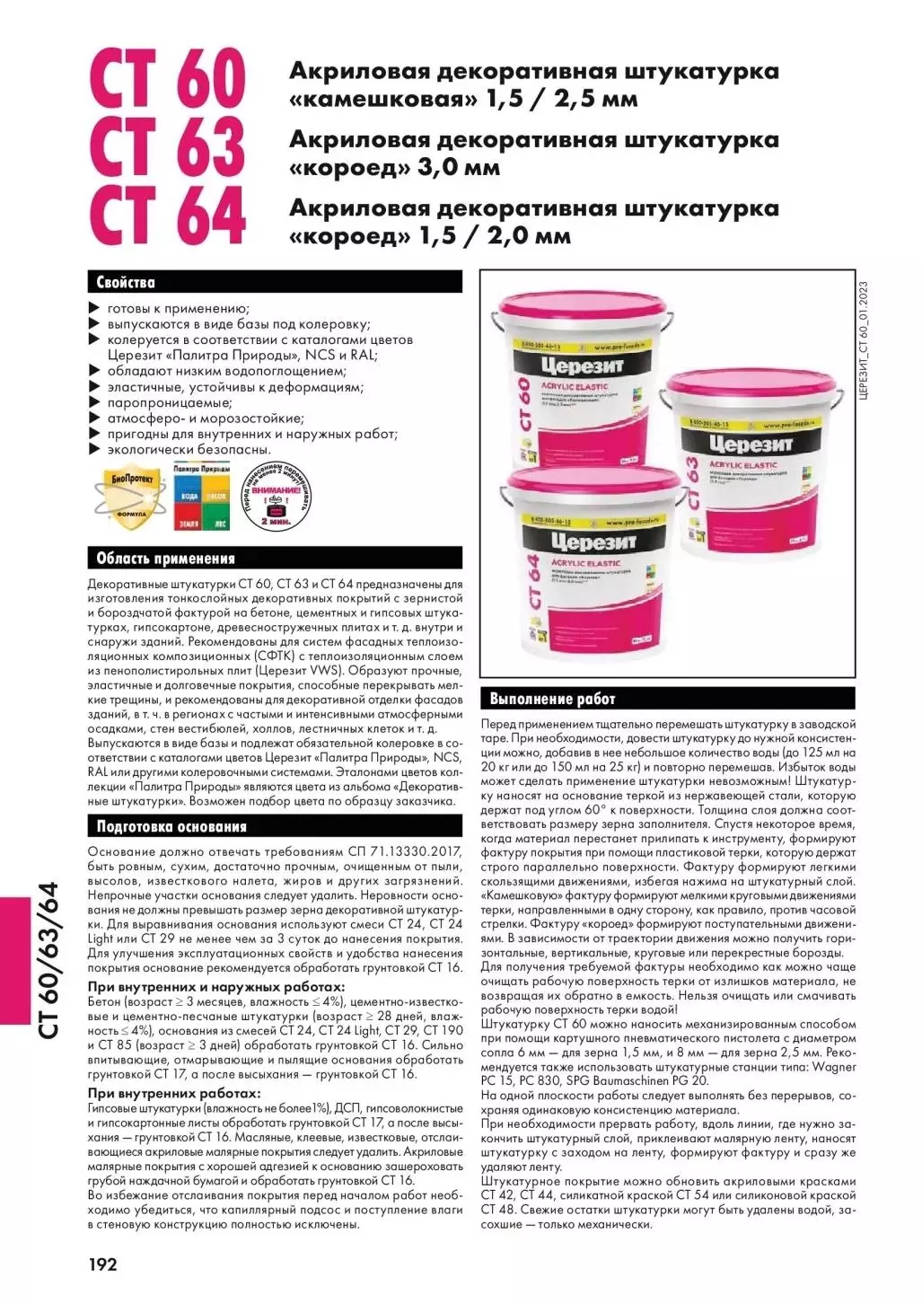 Работы следует выполнять в сухих условиях, при температуре воздуха и основания от +5 до +30 °C и относительной влажности воздуха не выше 80%. При работе следует пользоваться инструментами из нержавеющих материалов. Штукатурное покрытие в течение 3 суток после нанесения следует предохранять от контакта с водой и понижения температуры ниже +5 °C. Запрещается выполнять отделку фасада при прямом воздействии солнечных лучей в жаркую погоду, при сильном ветре, а также во время дождя и по мокрым поверхностям после дождя. Строительные леса должны быть защищены от солнца, ветра и дождя фасадными сетками. На здании должны быть установлены кровля, водостоки, отливы. Выполненное штукатурное покрытие до высыхания следует защищать от прямых солнечных лучей, дождя и сильного ветра. Наличие в составе натуральных наполнителей может привести к различиям во внешнем виде, поэтому на одной поверхности сле- дует использовать продукт с одинаковым номером партии (см. на упаковке) или предварительно смешать материалы разных партий в пропорции 1:1. Используемые минеральные наполнители являются природными материалами и могут содержать более темные фракции, что не является недостатком, а подтверждает природное происхождение сырьевых компонентов. Для получения однородной фактуры следует обеспечить достаточное количество работников на каждом уровне лесов и соединение захваток между соседними уровнями выполнять методом «мокрое по мокрому». Колеровку выполняют пигментными пастами Церезит. Ответственность за результат колеровки несет организация, выполняющая колеровку. Перед применением необходимо выполнить пробное нанесение и проверить высохшее покрытие на соответствие цвету. Грунтовку CT 16 рекомендуется применять в цвете, близком к цвету используемой штукатурки. Применение на фасадах материалов интенсивных или темных цветов с коэффициентом отражения менее 25% должно быть ограничено небольшими поверхностями, занимающими не более 10% фасада, например, отдельными архитектурными деталями. Внутреннюю отделку следует выполнять только в хорошо проветриваемых помещениях по высушенному основанию, а после окончания работ поддерживать циркуляцию воздуха до полного высыхания покрытия.