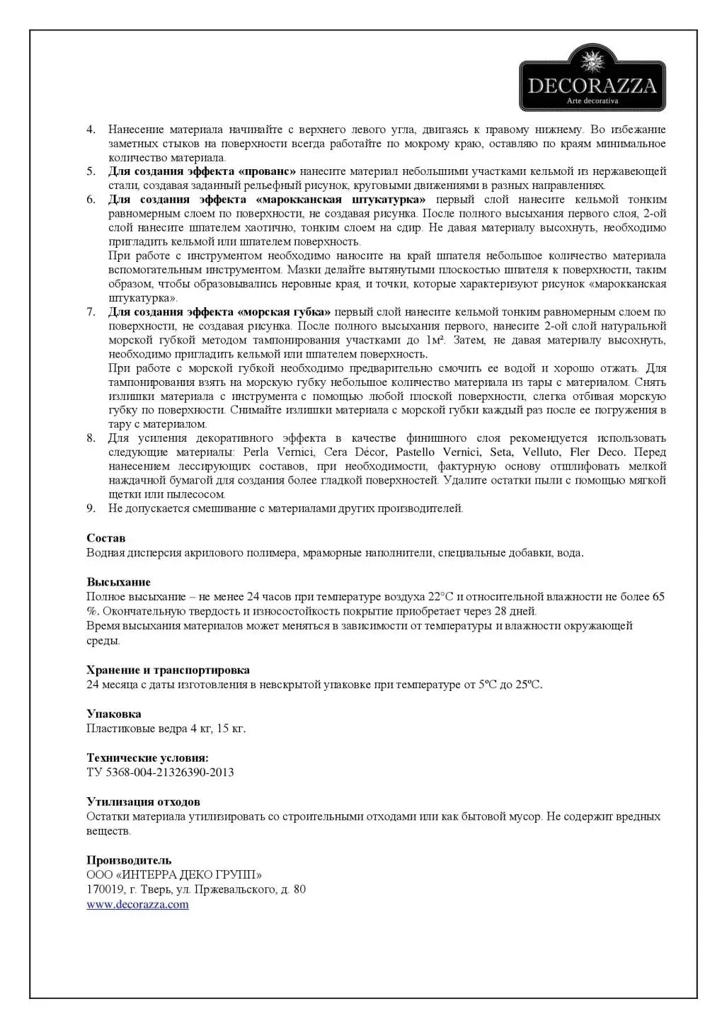 Чтобы сделать готовую поверхность более привлекательной в декоративном плане, после полного высыхания, нанести лессирующие составы Perla Vernici, Cera Decor, Pastello Vernici, Lucido, Seta, Velluto. При необходимости, для создания более гладкой поверхности, фактурную основу отшлифуйте мелкой наждачной бумагой.