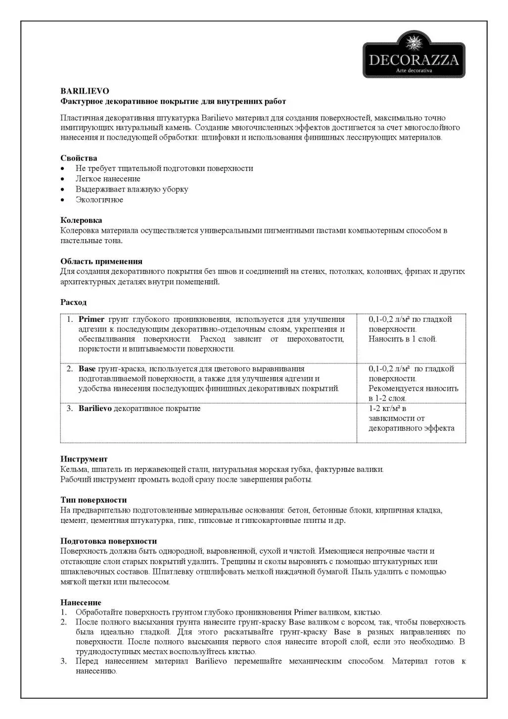 Перед использованием декоративную штукатурку Barilievo нужно перемешать механическим способом. Нанесение начинайте с верхнего левого угла, двигаясь к правому нижнему. Во избежание заметных стыков на поверхности всегда работайте по мокрому краю, оставляя по краям минимальное количество штукатурки.