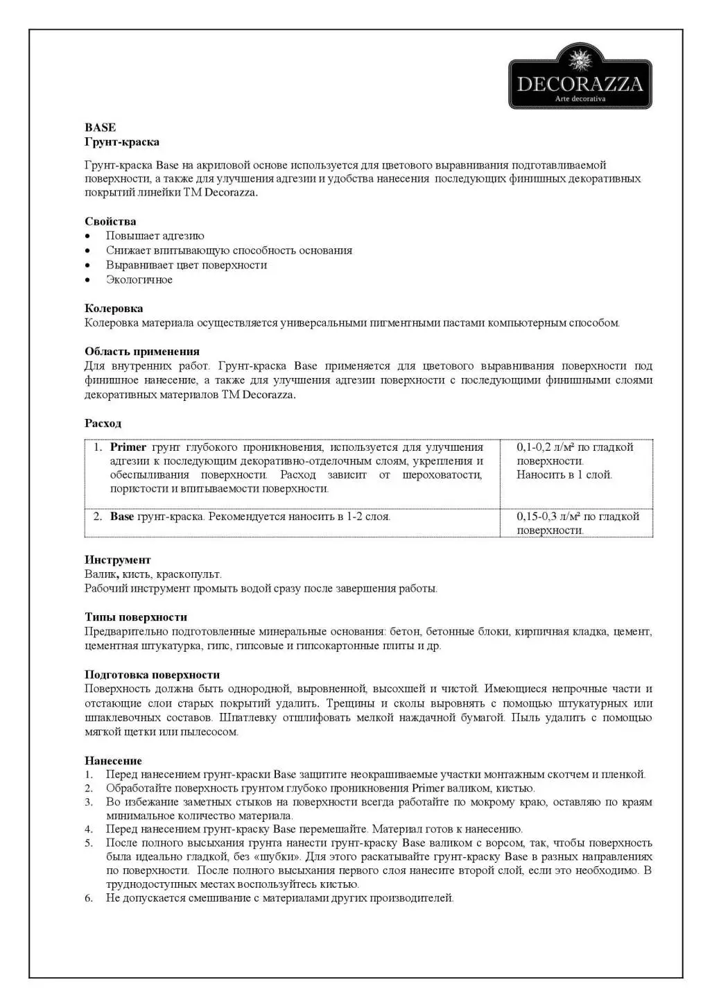 Благодаря хорошей укрывистости и простоте нанесения грунтовочную краску Base можно использовать для самых разные материалов. Она практически не имеет запаха и совершенно безопасна для здоровья, поэтому рекомендуется для работ внутри помещения. Обладая отличной влагостойкостью, краска Base Decorazza может с успехом применяться в помещениях с повышенной влажностью – кухнях, ванных комнатах, саунах или банях. Обладая высокой эксплуатационной нагрузкой, может использоваться и как самостоятельное покрытие, при окраске гостиных, коридоров, кухонь, спален, детских комнат, залов и других помещений, поскольку легко колеруется в любые цвета и оттенки.