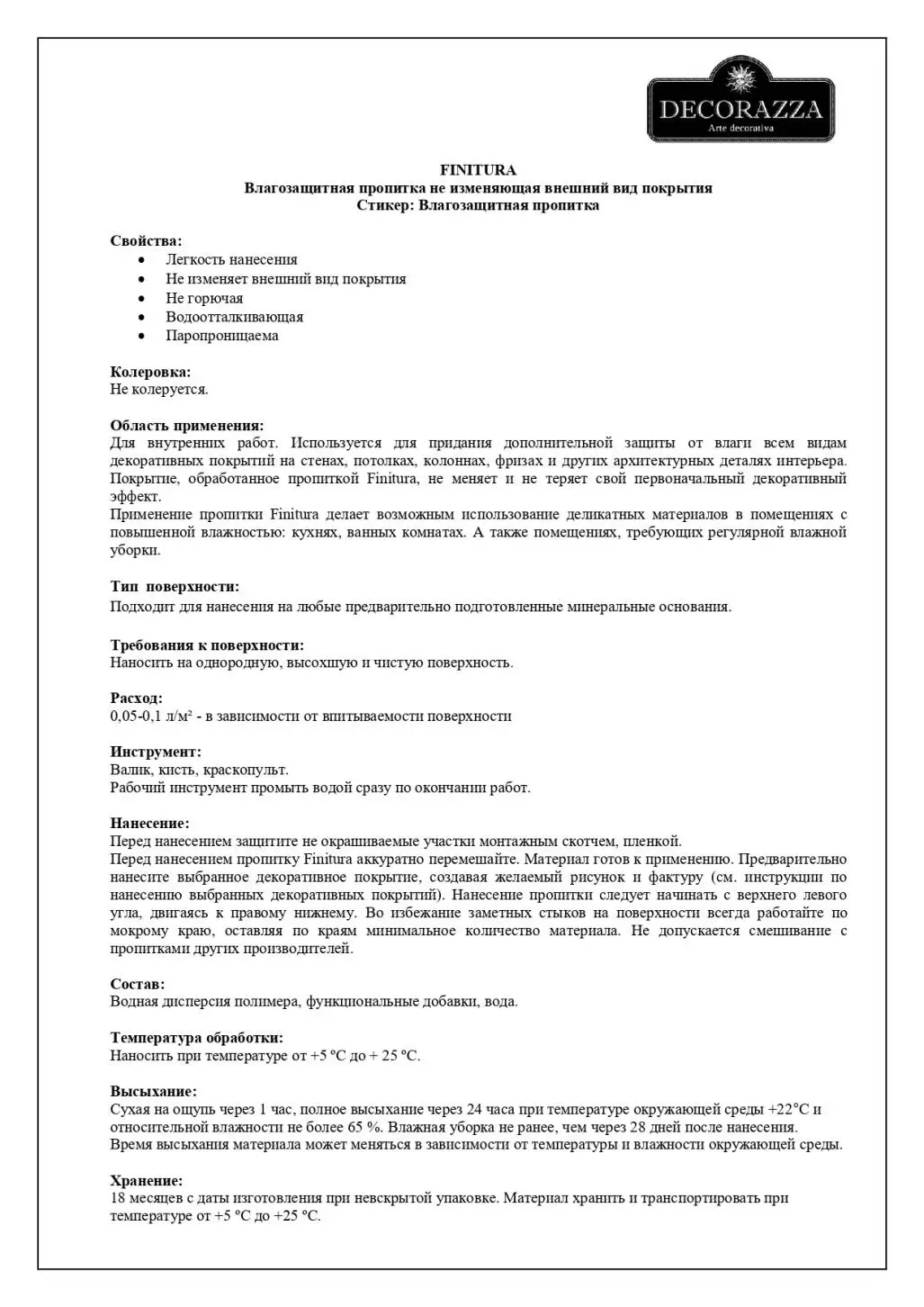 Водозащитная пропитка Finitura разработана специалистами компании Decorazza специально для помещений с повышенной влажностью. Она подходит для всех декоративных покрытий одноименного производителя, но может использоваться и для других материалов. Благодаря FINITURA использование таких деликатных материалов, как шёлк, в местах, требующих регулярной влажной уборки стало возможным. Теперь можно не переживать за долговечность декора в помещениях с повышенной влажностью, например, ванных комнатах, кухнях, подвалах или складах. Благодаря отсутствию запаха пропитка от влаги Финитура пригодна к использованию в замкнутых помещениях.