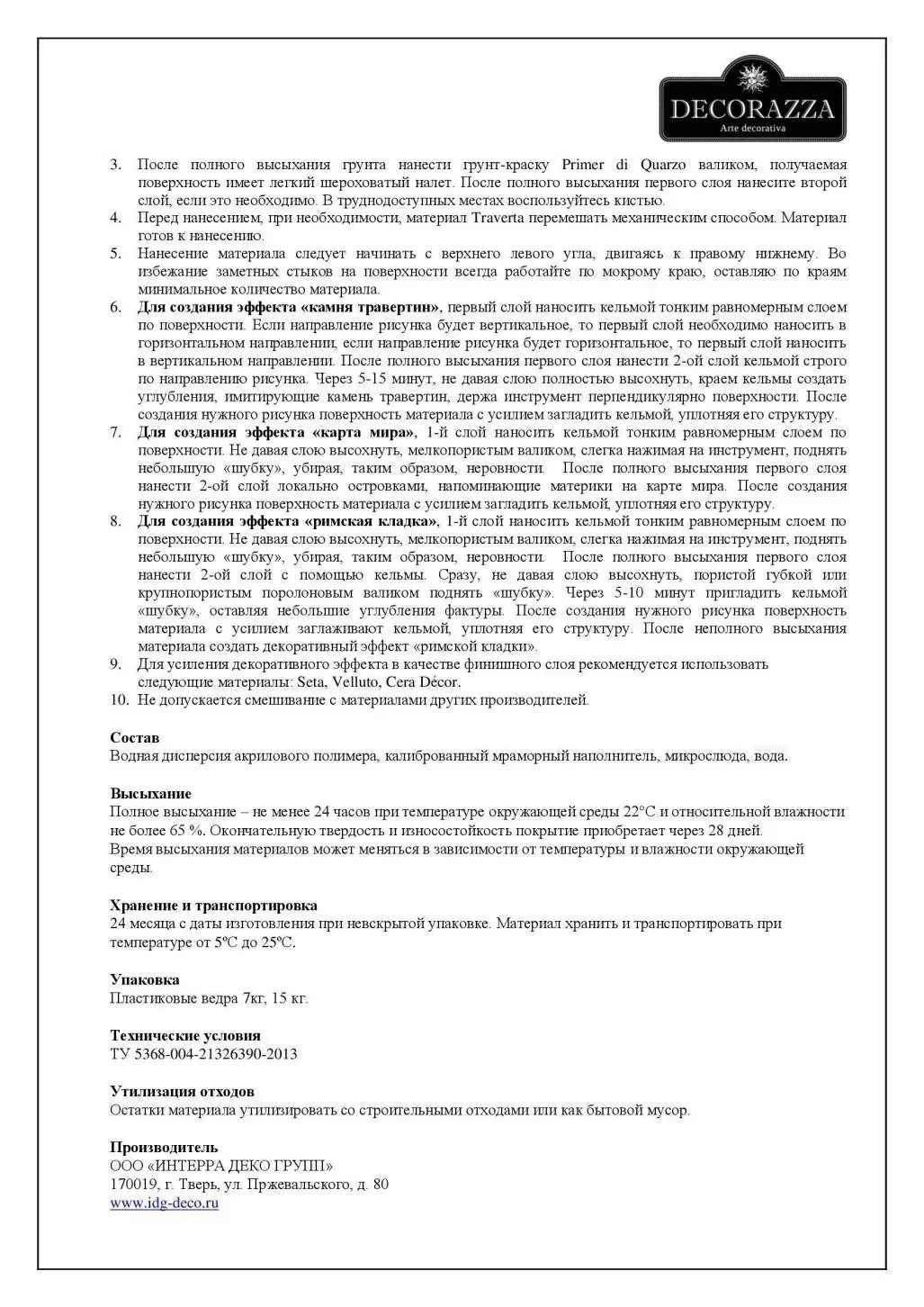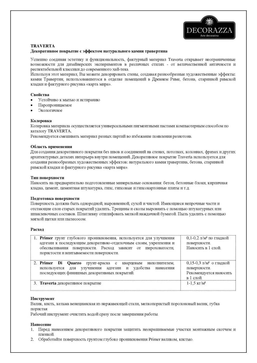 Настенное покрытие Traverta от Decorazza подходит для нанесения как на минеральные основания, такие как: бетон, бетонные блоки, кирпичная кладка, цемент, цементная штукатурка, гипс, гипсовые и гипсокартонные плиты, так и на деревянные поверхности - ДСП, ДВП и другие.