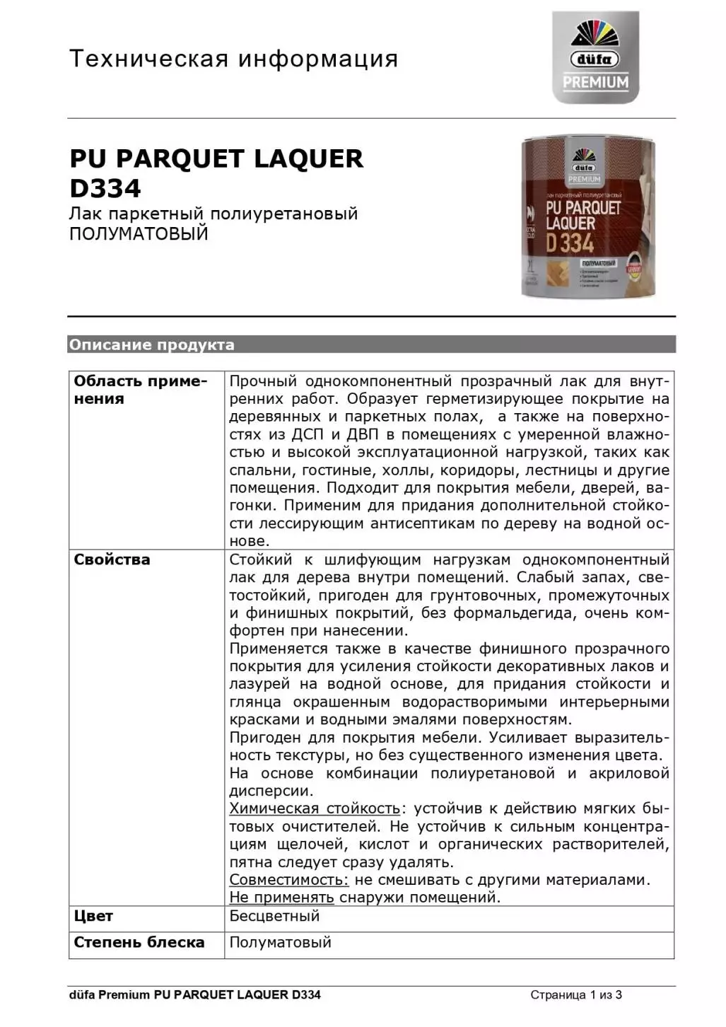Прочный однокомпонентный прозрачный лак для внутренних работ. Образует герметизирующее покрытие на деревянных и паркетных полах, а также на поверхностях из ДСП и ДВП в помещениях с умеренной влажностью и высокой эксплуатационной нагрузкой, таких как спальни, гостиные, холлы, коридоры, лестницы и другие помещения. Подходит для покрытия мебели, дверей, вагонки. Применим для придания дополнительной стойкости лессирующим антисептикам по дереву на водной основе.