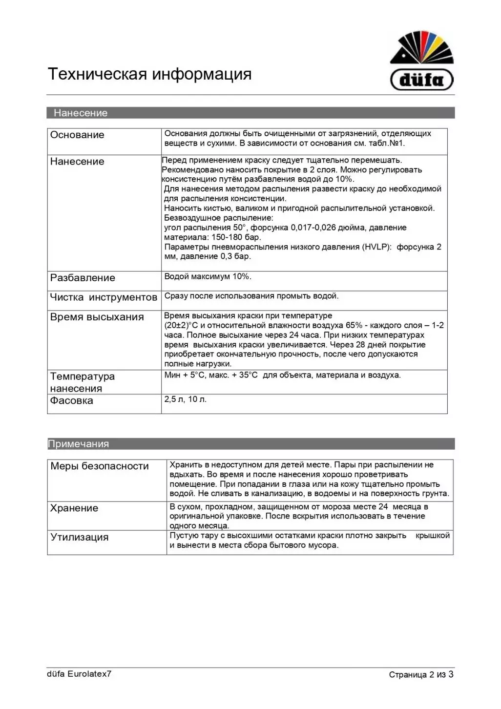 Время высыхания: Время высыхания краски при температуре (20±2)°С и относительной влажности воздуха 65% - каждого слоя – 1-2 часа. Полное высыхание через 24 часа. При низких температурах время высыхания краски увеличивается. Через 28 дней покрытие приобретает окончательную прочность, после чего допускаются полные нагрузки.