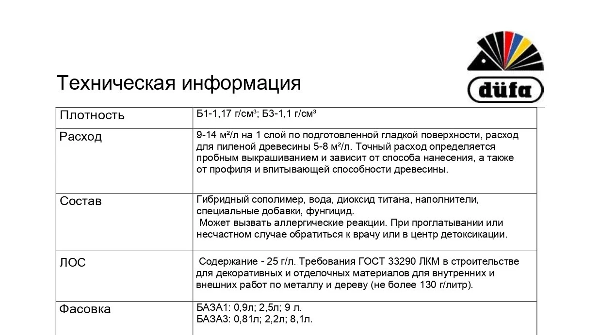 Максимально долгий срок службы покрытия на фасаде достигается при регулярном контроле дефектов (трещины, градобоины, помет птиц, отслоения, вытекание смолы и проч.) и их ремонте не реже, чем 1 раз в год. Указанный срок службы 15 лет распространяется на полную систему покрытия фасада (грунт düfa Wood Base AQUA + 3 слоя düfa WoodColor), нанесенную согласно технологии на новую древесину без пороков и брака. Внутри помещений и на фасаде под навесом срок службы покрытия увеличивается.