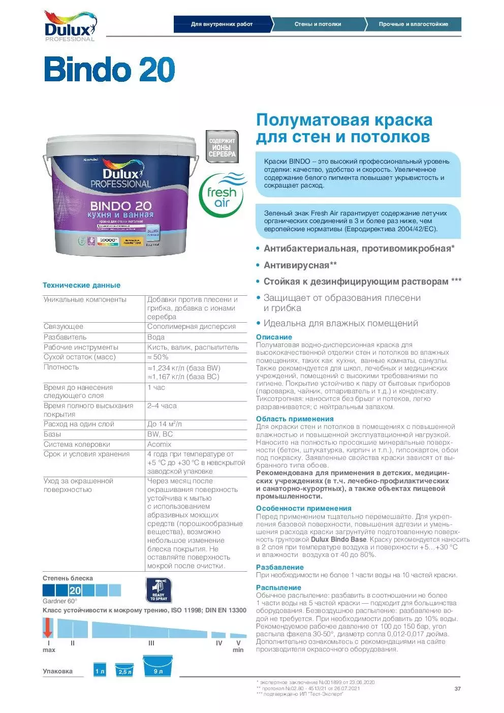 Полуматовая водно-дисперсионная краска предназначена для отделки стен и потолков во влажных помещениях, таких как кухни, ванные комнаты, санузлы. Также рекомендуется для школ, лечебных и медицинских учреждений, помещений с высокими требованиями по гигиене, поскольку сертифицирована для применения в детских, медицинских учреждениях, в том числе в лечебно-профилактических и санаторно-курортных, а также на объектах пищевой промышленности. Полученное покрытие устойчиво к пару от бытовых приборов (пароварка, чайник, отпариватель и т.д.) и конденсату. Может наноситься на полностью просохшие минеральные поверхности (бетон, штукатурка, кирпич и т.п.), гипсокартон, обои под покраску.