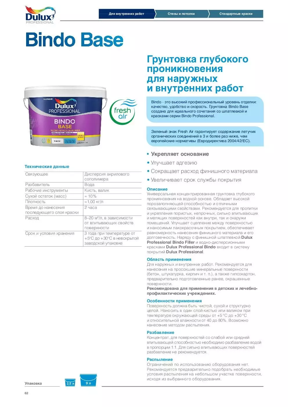 - Входит в систему покрытий Dulux PROF, куда также включена финишная шпатлевка DULUX MAXI и дисперсионные краски BINDO