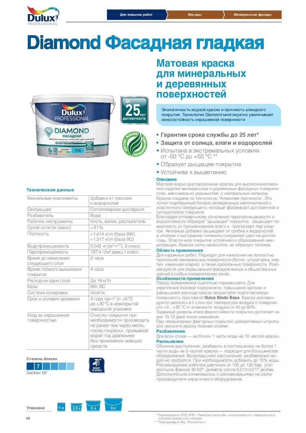 Матовая краска Dulux на водно-дисперсионной основе предназначена для отделки минеральных и деревянных фасадных поверхностей. Будучи изготовленной по технологии "Алмазная прочность" позволяет получить долговечное и исключительно стойкое покрытие. Правильно подобранный баланс минеральных наполнителей и эластичного связующего гарантирует после высыхания увеличенную износостойкость поверхности. Подходит для наружных работ, в частности для отделки полностью просохших минеральных поверхностей, включая бетон, штукатурку, кирпичную и каменную кладку, а также древесину. Рекомендована для окрашивания фасадов жилых и общественных зданий в любых климатических условиях.