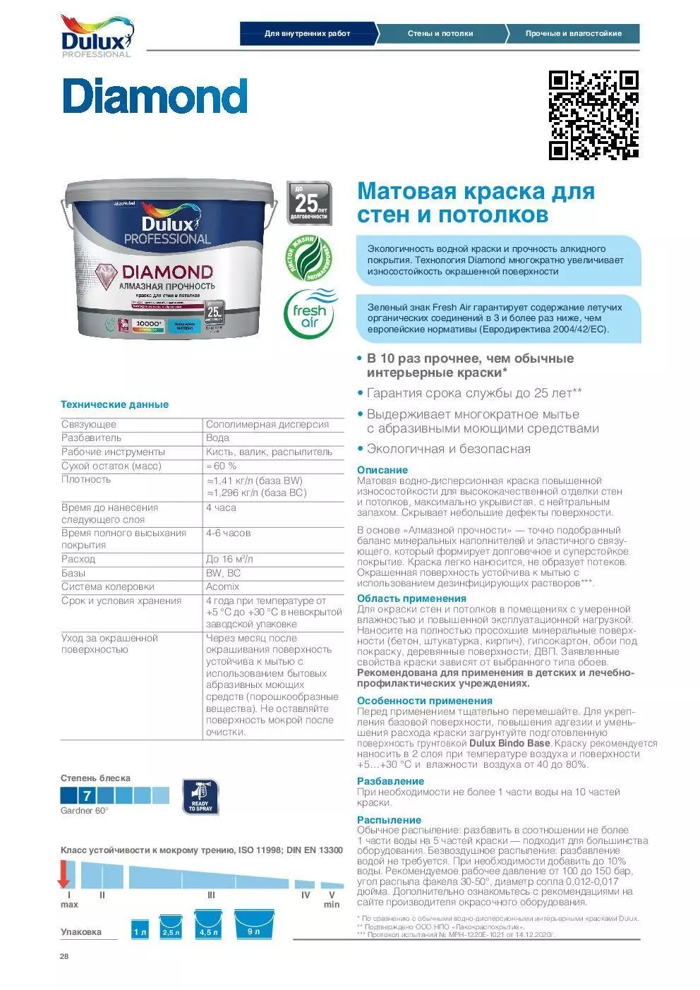 Перед применением разбавить в рекомендованной пропорции и тщательно перемешать. Краску Dulux Professional Diamond рекомендуется наносить в два слоя при температуре от +5 °C до +30 °C, относительной влажности воздуха от 40 до 80 %. Использовать для нанесения кисть с синтетическим ворсом, валик для водно-дисперсионной краски или распылитель. Большие поверхности рекомендуется окрашивать методом распыления.