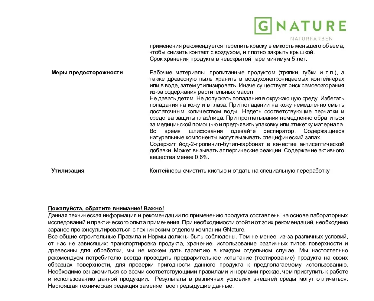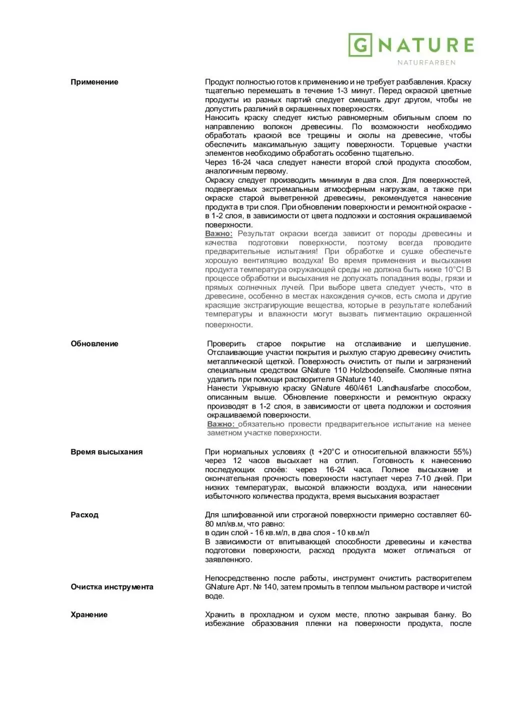 Используйте кисть с густым, плотным ворсом. Тщательно окрасьте все сколы, повреждения и трещины на поверхности. Для надежной защиты древесины и получения равномерного оттенка, производите окраску в два слоя. Непосредственно после работы, инструмент очистить растворителем GNature Арт. № 140, затем промыть в теплом мыльном растворе и чистой воде.
