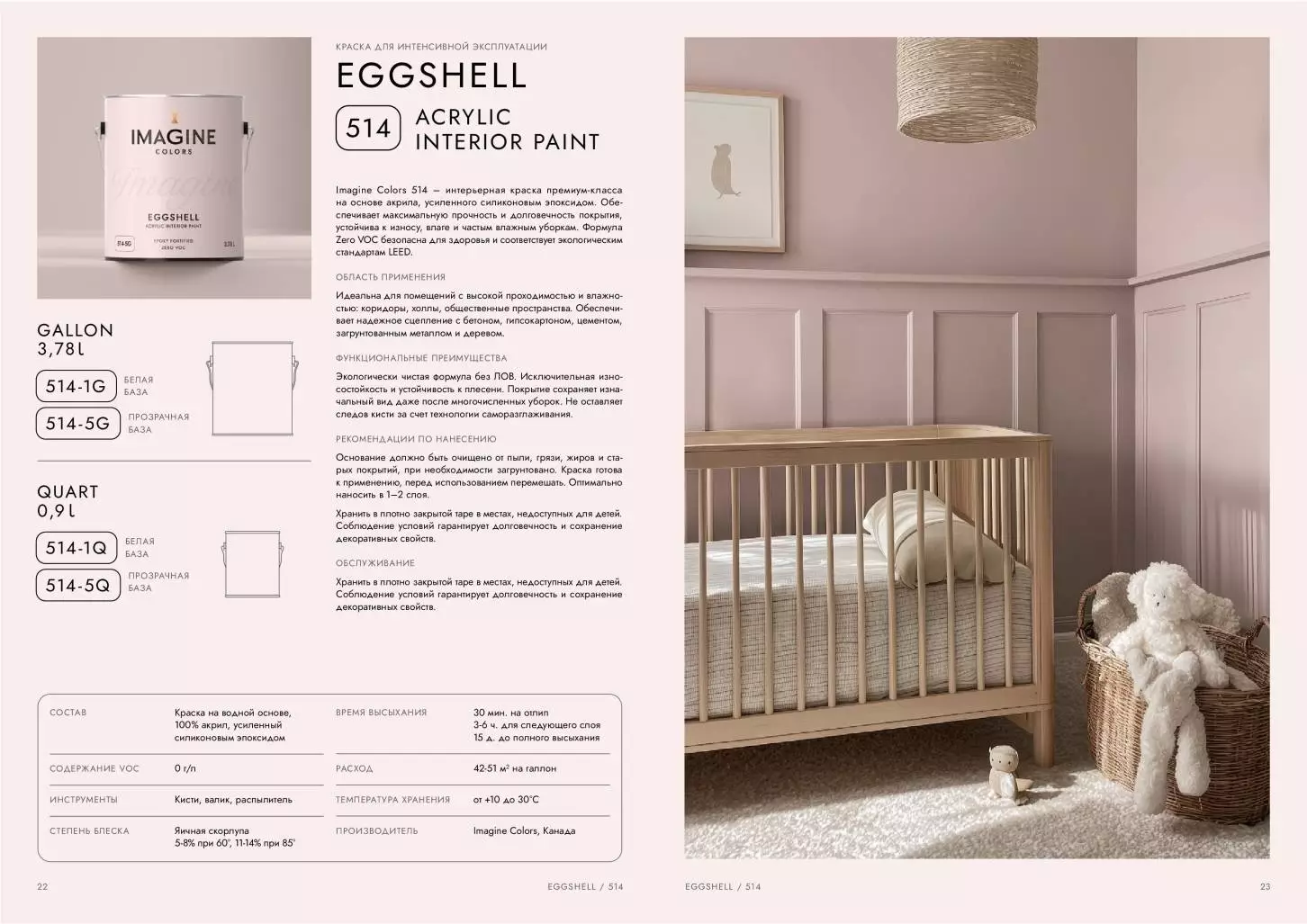 Краска из Imagine Colors 514 100% акрила, усиленная эпоксидной смолой, имеет отличные эксплуатационные характеристики. Добавка смолы усиливает прочность и износостойкость покрытия. Краска подходит для помещений с высокой проходимостью, требующих частой уборки, а также для помещений с повышенной влажностью. Краска безопасна для здоровья благодаря нулевому содержанию ЛОВ.