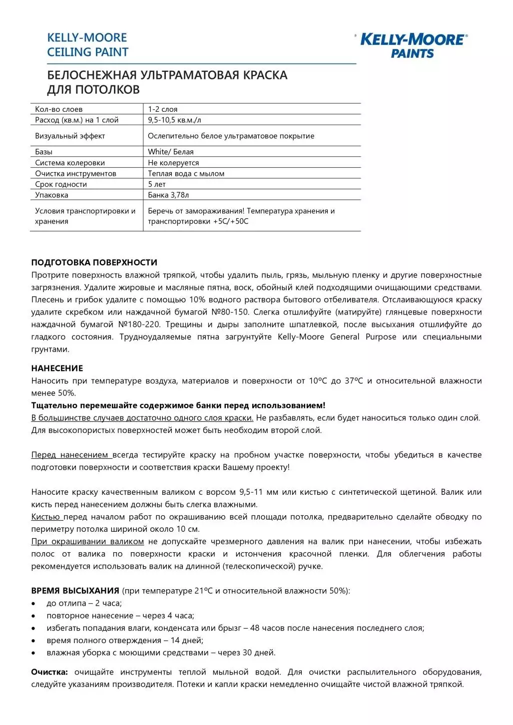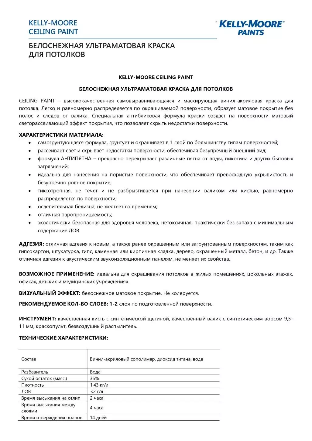 Kelly Moore Paints Ceiling - высококачественная самовыравнивающаяся и маскирующая винил-акриловая краска для потолка. Легко и равномерно распределяется по окрашиваемой поверхности, образует матовое покрытие без полос и следов от валика. Специальная антибликовая формула краски создаст на поверхности матовый светорассеивающий эффект покрытия, что позволяет скрыть недостатки поверхности.