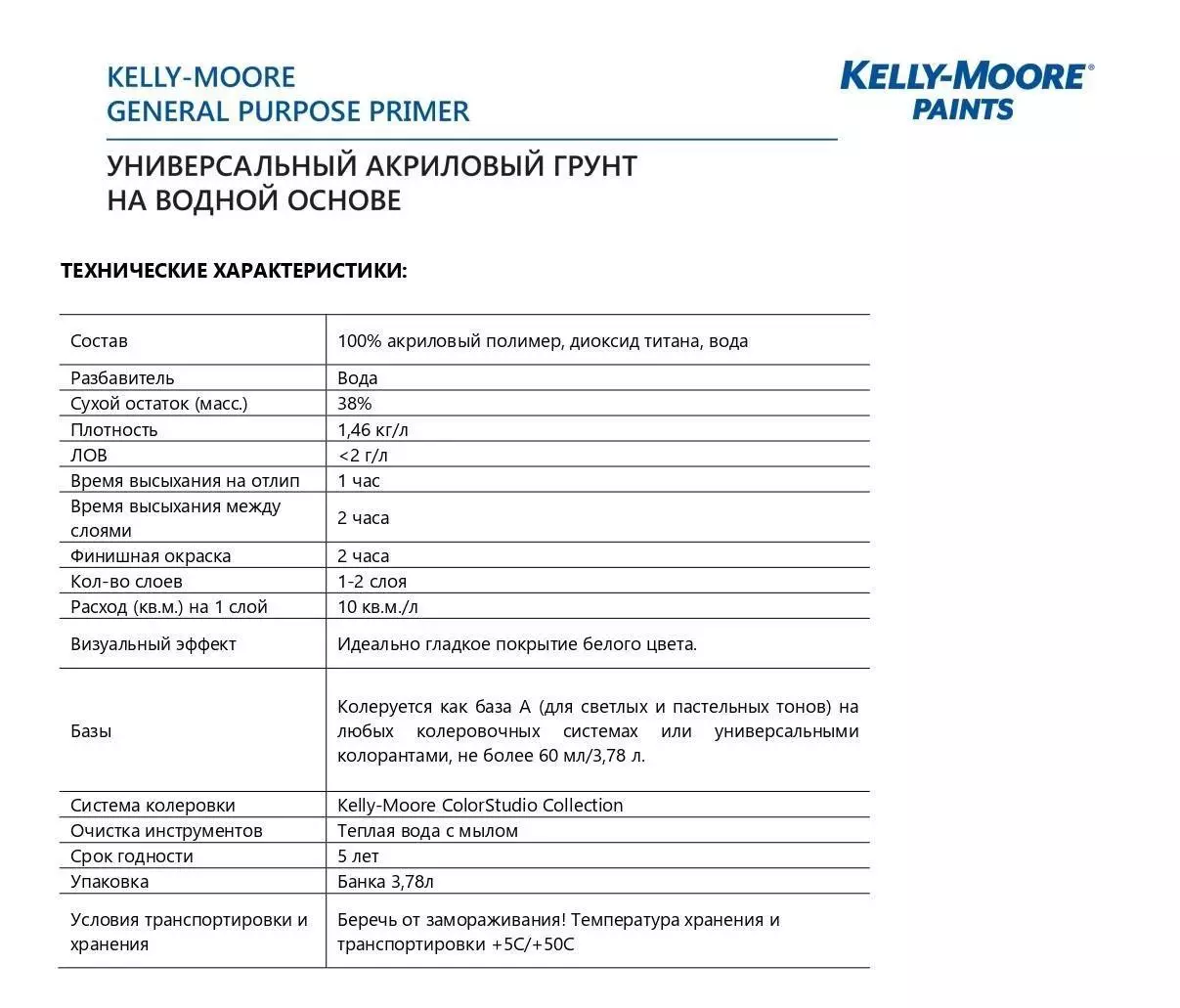 Kelly Moore Paints General Purpose Primer – высокоукрывистый 100% акриловый грунт-силер на водной основе, предназначенный для грунтования, усиления адгезии, пятноустранения и выравнивания большинства поверхностей.