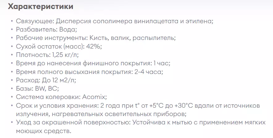 Матовая водно-дисперсионная (латексная) краска для стен и потолков. При нанесении образует покрытие с высокими декоративными свойствами и отличной адгезией. Подчеркивает рельеф поверхности. Окрашенная поверхность выдерживает мытье с применением мягких моющих средств. Краска легко наносится и быстро высыхает.