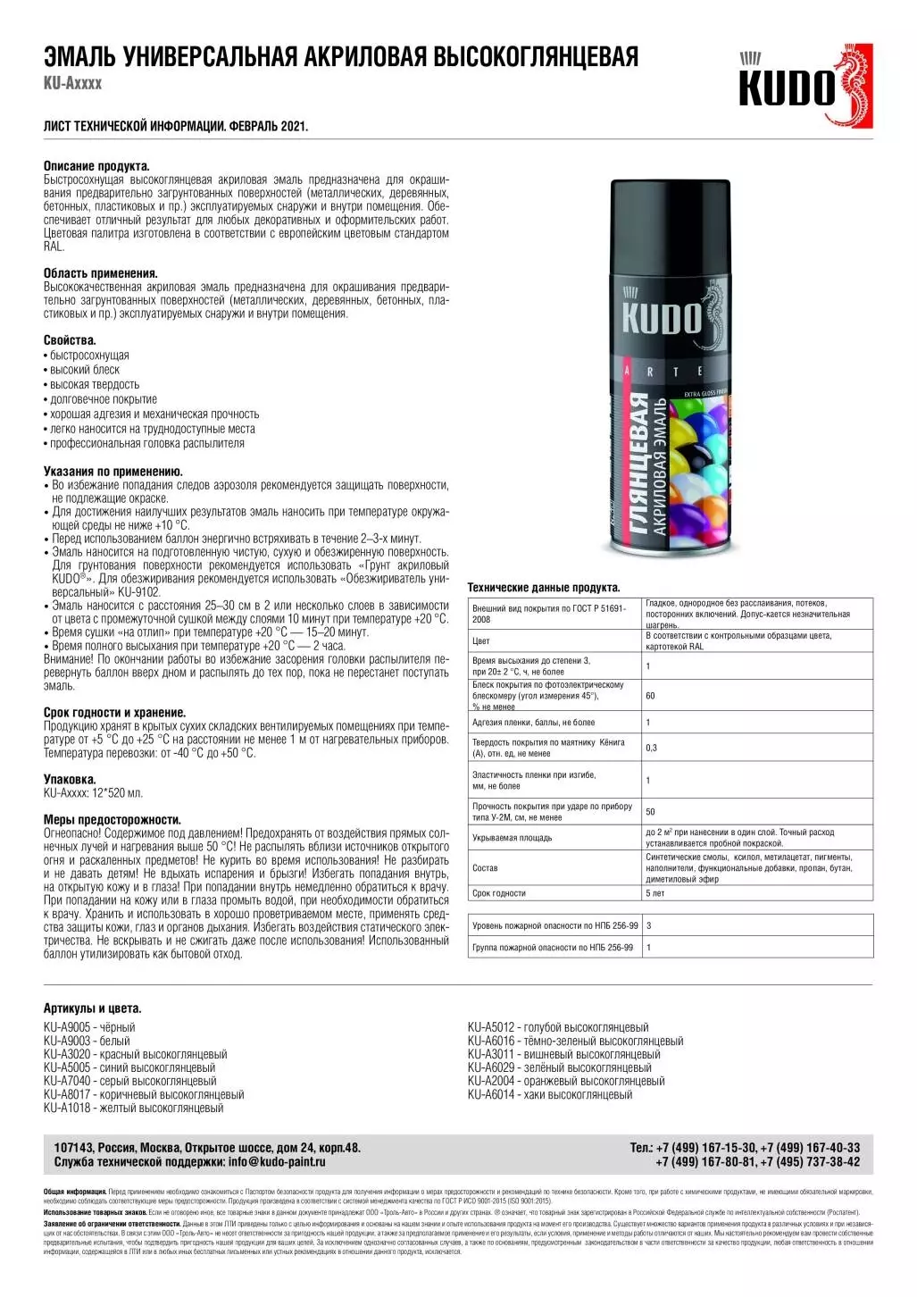 Во избежание попадания следов аэрозоля рекомендуется защищать поверхности, не подлежащие окраске. Для достижения наилучших результатов эмаль наносить при температуре окружающей среды не ниже +10°С. Перед использованием баллон энергично встряхивать в течение 2–3-х минут. Эмаль наносится на подготовленную чистую, сухую и обезжиренную поверхность. Для грунтования поверхности рекомендуется использовать «Грунт акриловый KUDO®». Для обезжиривания рекомендуется использовать «Обезжириватель универсальный» KU-9102. Эмаль наносится с расстояния 25–30 см в 2 или несколько слоев в зависимости от цвета с промежуточной сушкой между слоями 10 минут при температуре +20°С. Время сушки «на отлип» при температуре +20 °С — 15–20 минут. Время полного высыхания при температуре +20 °С — 2 часа. Внимание! По окончании работы во избежание засорения головки распылителя перевернуть баллон вверх дном и распылять до тех пор, пока не перестанет поступать эмаль.