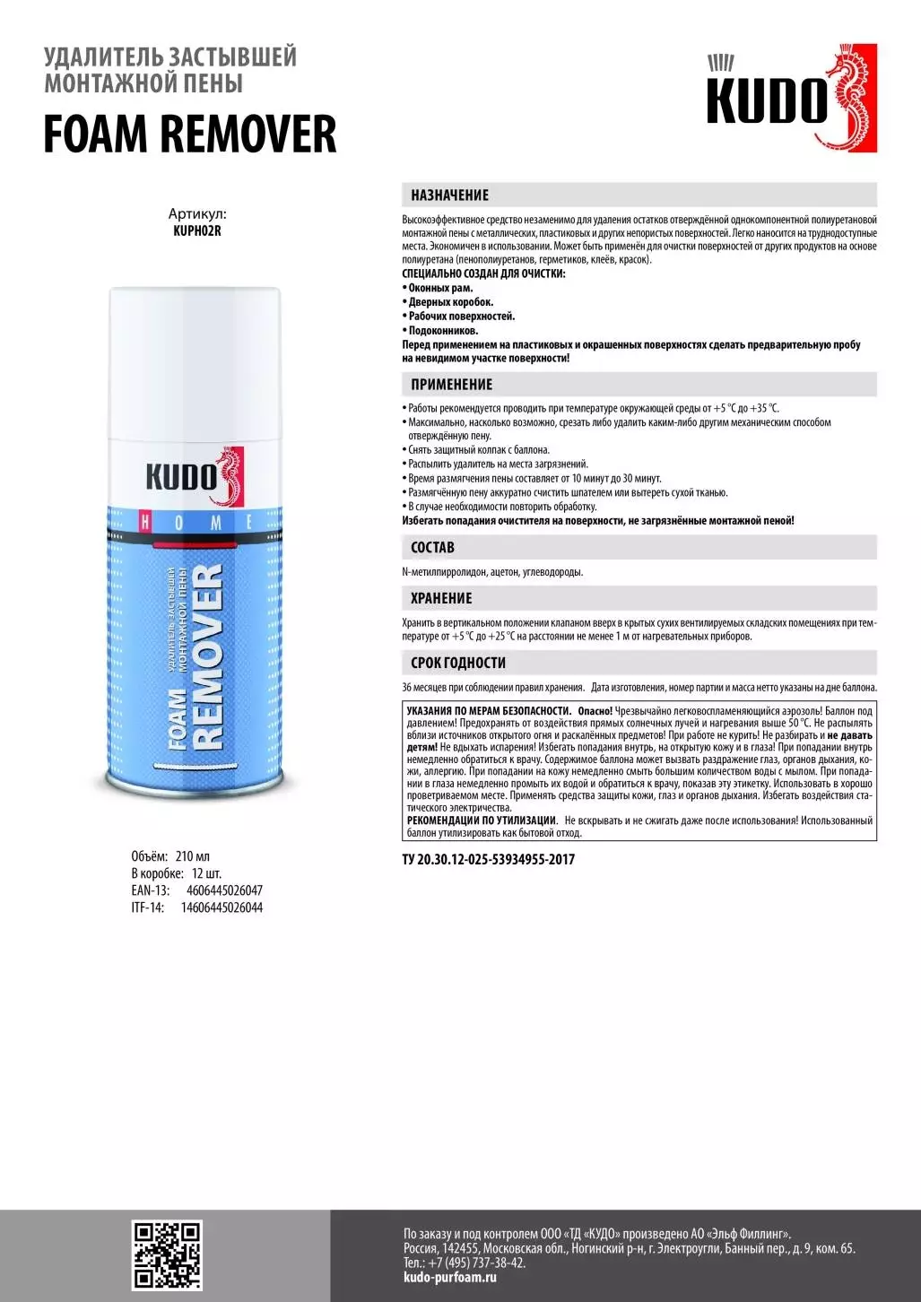Высокоэффективное средство незаменимо для удаления остатков отвержденной однокомпонентной полиуретановой монтажной пены с металлических, пластиковых и других непористых поверхностей.