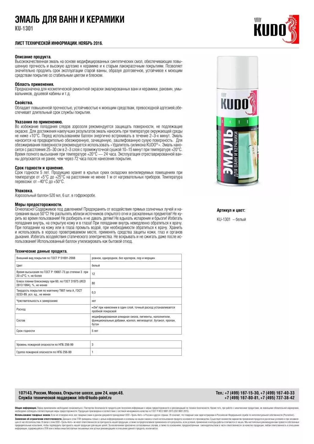 Во избежание попадания следов аэрозоля рекомендуется защищать поверхности, не подлежащие окраске. Для достижения наилучших результатов эмаль наносить при температуре окружающей среды не ниже +10°С. Перед использованием баллон энергично встряхивать в течение 2–3-х минут. Эмаль наносится на предварительно обезжиренную, зачищенную, зашлифованную сухую поверхность. Для обезжиривания поверхности рекомендуется использовать «Удалитель силикона KUDO®». Эмаль наносится с расстояния 25–30 см в 2–3 слоя с промежуточной сушкой 10–15 минут при температуре +20°С. Время полного высыхания при температуре +20°С — 24 часа. Эксплуатация отреставрированной ван- ны допускается не ранее, чем через 72 часа после нанесения покрытия.