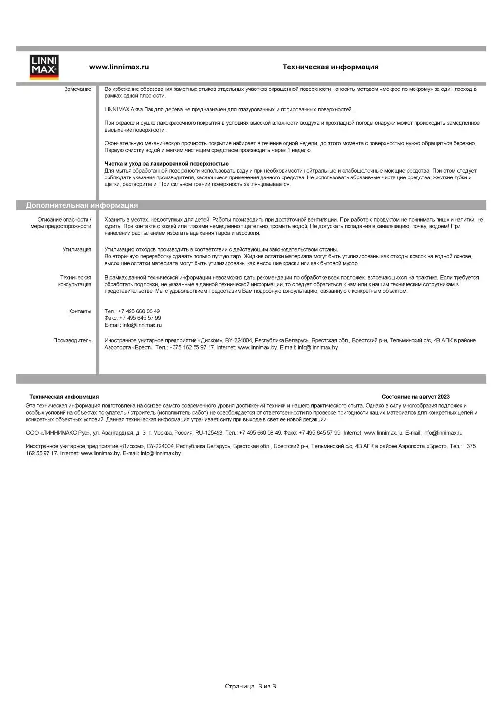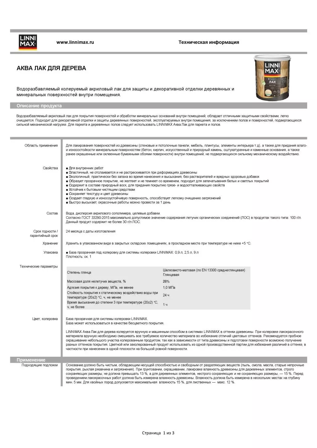 Водоразбавляемый акриловый лак для покрытия поверхностей и обработки минеральных оснований внутри помещений, обладает отличными защитными свойствами, легко очищается. Подходит для декоративной отделки и защиты деревянных поверхностей, эксплуатируемых внутри помещения. За исключением полов и поверхностей, подвергающихся сильной механической нагрузке. Для паркета и деревянных полов следует использовать LINNIMAX Аква Лак для паркета и полов.