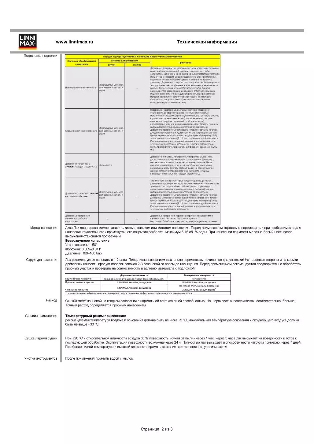 Лак рекомендуется наносить в 1-2 слоя. Перед использованием тщательно перемешать начиная со дна упаковки! На торцевые стороны и на кромки древесины наносить продукт поперёк волокон 2-3 раза слой за слоем до насыщения. Перед применением рекомендуется предварительно обработать пробный участок и проверить на совместимость и адгезию материала с подложкой.