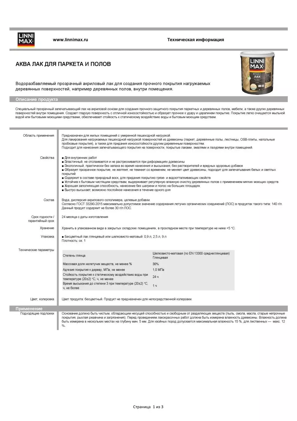 Акриловый лак на водной основе для создания прочного защитного покрытия паркетных и деревянных полов, мебели, а также других деревянных поверхностей внутри помещения.