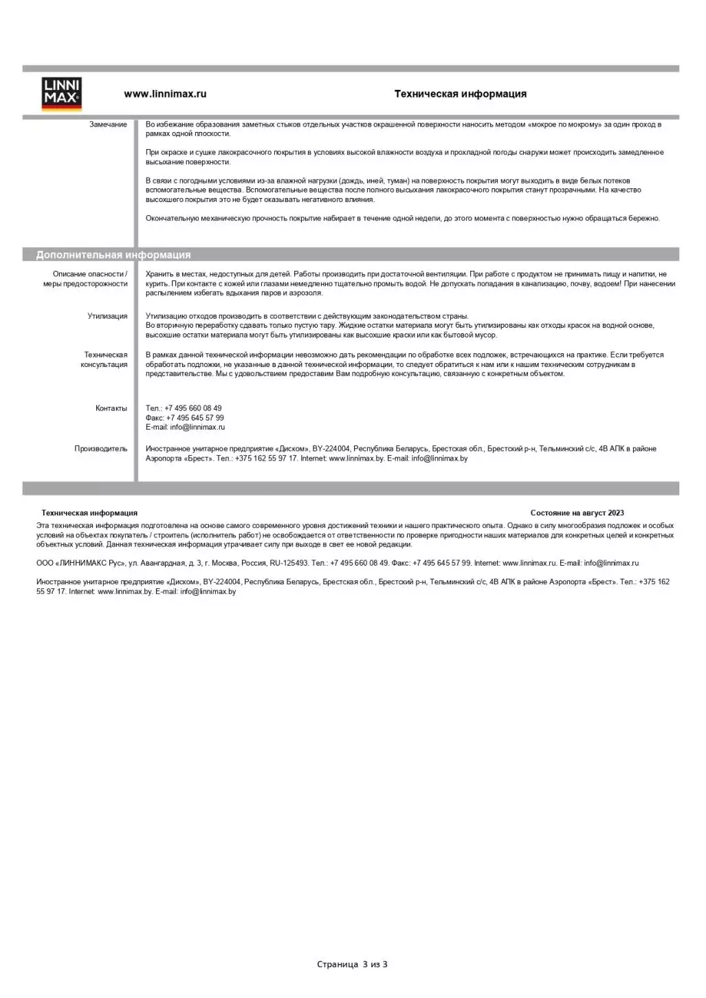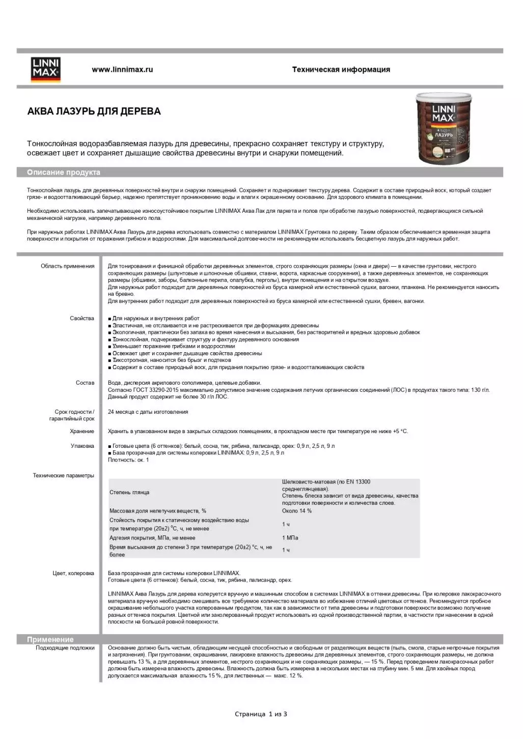 База прозрачная для системы колеровки LINNIMAX. Готовые цвета (6 оттенков): белый, сосна, тик, рябина, палисандр, орех. LINNIMAX Аква Лазурь для дерева колеруется вручную и машинным способом в системах LINNIMAX в оттенки древесины. При колеровке лакокрасочного материала вручную необходимо смешивать все требуемое количество материала между собой во избежание отличий цветовых оттенков. Рекомендуется пробное окрашивание небольшого участка колерованным продуктом, так как в зависимости от типа древесины и подготовки поверхности возможно получение разных оттенков покрытия. Цветной или заколерованный продукт использовать из одной производственной партии, в частности при нанесении в одной плоскости на большой ровной поверхности.