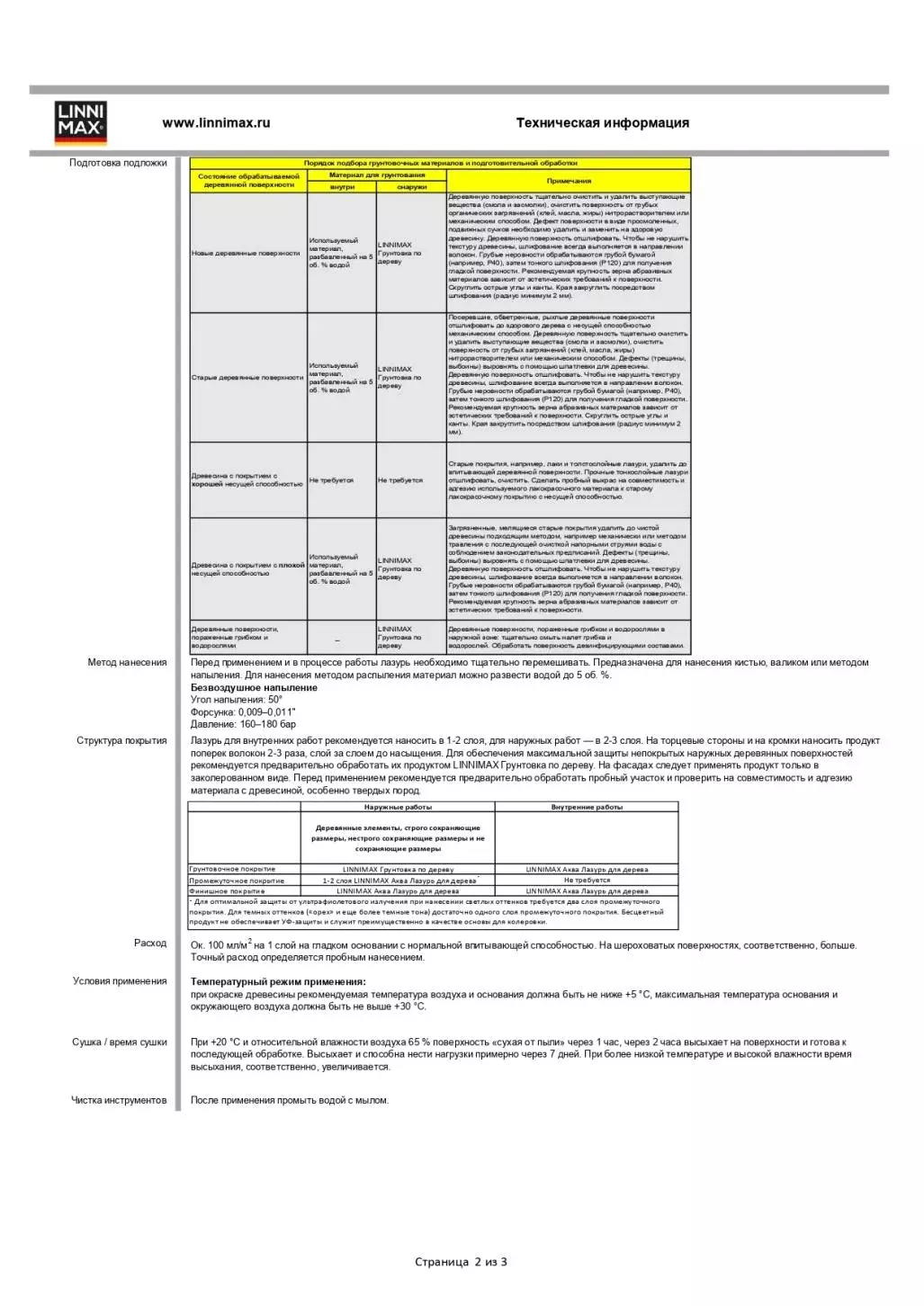 Лазурь для внутренних работ рекомендуется наносить в 1-2 слоя, для наружных работ - в 2 слоя. На торцевые стороны и на кромки наносить продукт поперёк волокон 2-3 раза слой за слоем до насыщения. Для оюеспечения максимальной защиты непокрытых наружных деревянных поверхностей рекомендуется предварительно обработать их продуктом LINNIMAX Грунтовка по дереву. На фасадах следует применять продукт только в заколерованном виде. Перед применением рекомендуется предварительно обработать пробный участок и проверить на совместимость и адгезию материала с древесиной, особенно твёрдых пород.