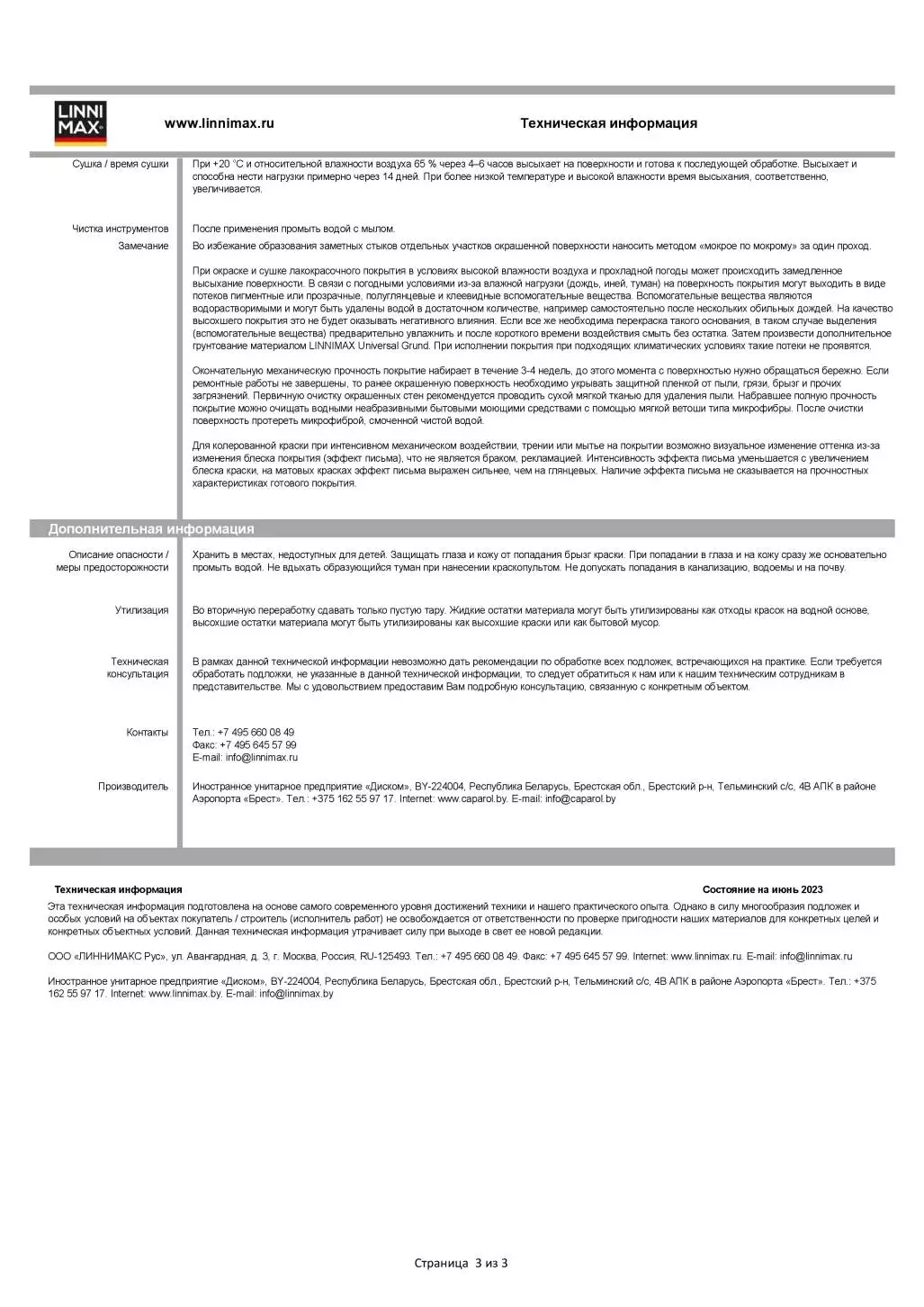 Продукт предназначен для компьютерной колеровки в системе LINNIMAX. Перед применением рекомендуется проверить точность цветового тона.