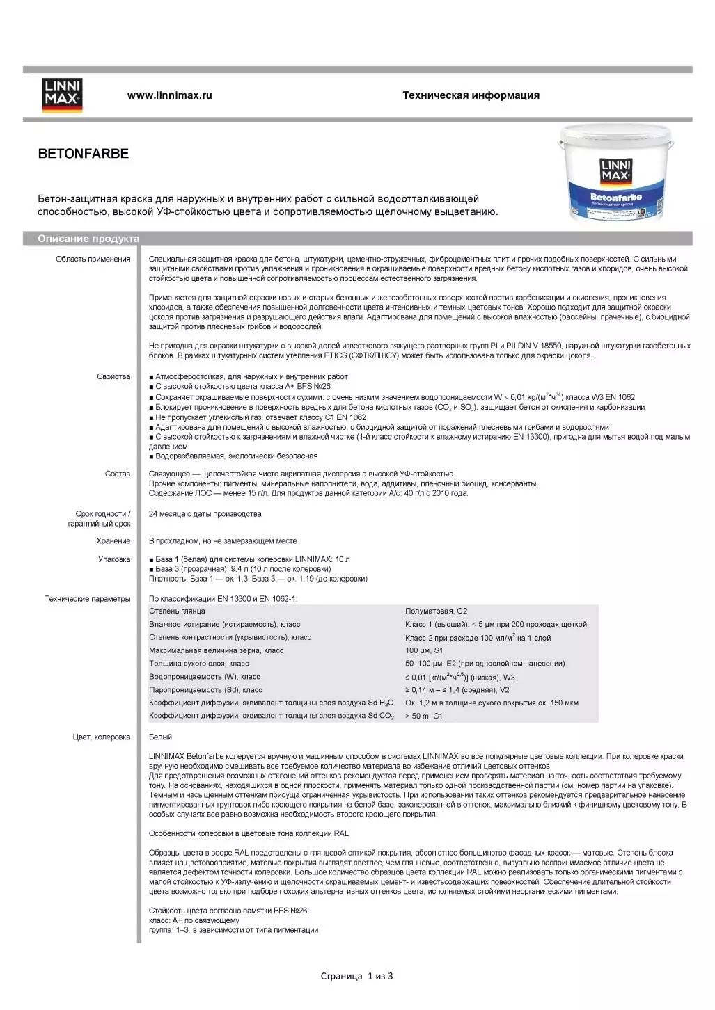 Специальная защитная краска для бетона, штукатурки, цементно-стружечных, фиброцементных плит и прочих подобных поверхностей. С сильными защитными свойствами против увлажнения и проникновения в окрашиваемые поверхности вредных бетону кислотных газов и хлоридов, очень высокой стойкостью цвета и повышенной сопротивляемостью процессам естественного загрязнения.
