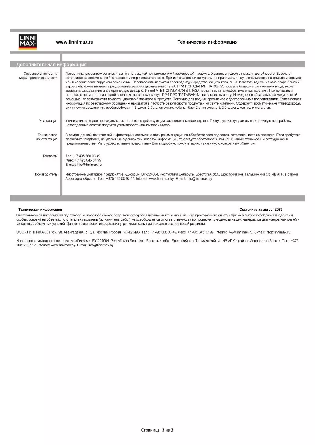 Эмаль рекомендуется наносить в 2 слоя с межслойной сушкой не более 2 ч, либо необходимо выдержать перерыв между нанесением слоев не менее 72 ч. Допускается нанесение материала методом «мокрый по мокрому» после высыхания предыдущего слоя «на отлип» (15-30 мин.). На неокрашенные деревянные поверхности предварительно нанести LINNIMAX Грунтовку для дерева. На торцевые стороны и на кромки древесины наносить продукт поперек волокон 2-3 раза, слой за слоем до насыщения. Перед применением рекомендуется предварительно обработать пробный участок и проверить на совместимость и адгезию материала с подложкой. Рекомендуемая толщина сухого лакокрасочного покрытия должна составлять 80-100 мкм в два слоя.