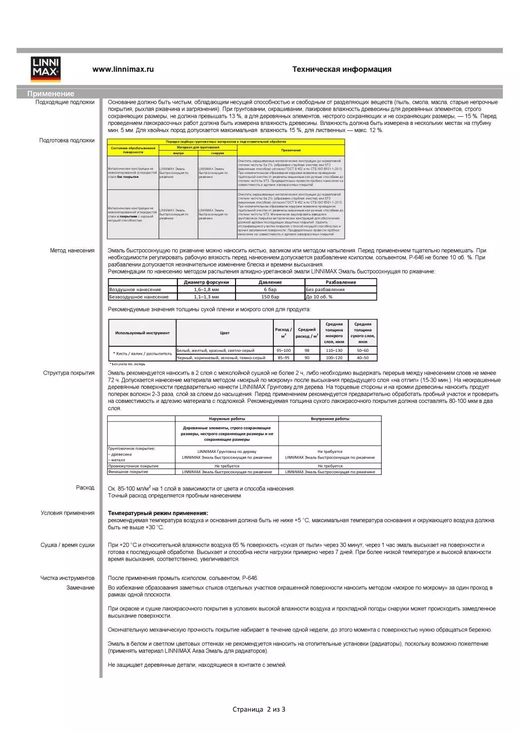 Эмаль быстросохнущую по ржавчине можно наносить кистью, валиком или методом напыления. Перед применением тщательно перемешать. При необходимости регулировать рабочую вязкость перед нанесением допускается разбавление ксилолом, сольвентом, Р-646 не более 10 об. %. При разбавлении допускается незначительное изменение блеска и времени высыхания. Рекомендации по нанесению методом распыления алкидно-уретановой эмали LINNIMAX Эмаль быстросохнущая по ржавчине.